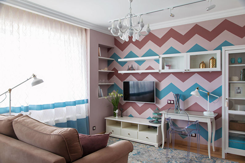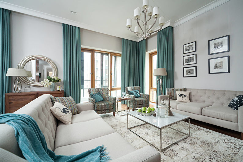 تتمثل المهمة الرئيسية للستائر في غرفة المعيشة في أن تكون عملية وأنيقة وذات صلة بالألوان. (في الصورة ، ستائر القاعة مصنوعة بألوان الباستيل). في الوقت نفسه ، ينبغي أن يساهموا في جو مريح وأن يتم دمجهم مع المفهوم العام للداخلية.