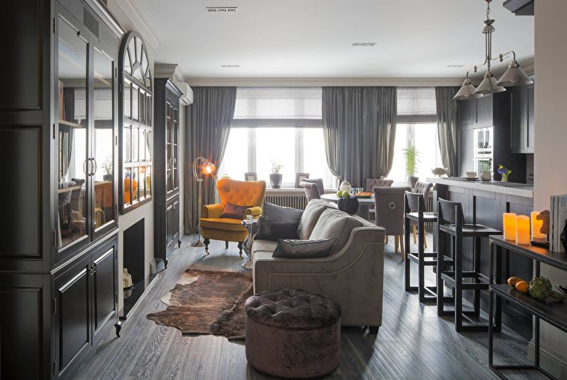 - في غرف المعيشة الكبيرة ، يمكنك تجربة الستائر بألوان داكنة ونسيج كثيف بأمان.