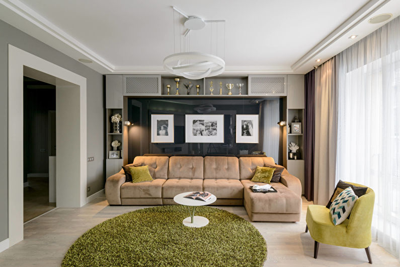 النمط الحديث الذي ظهر في بداية القرن العشرين لا يزال ذا صلة. يتميز بسهولة الإهمال والسهولة. أيضا ، ميزته المميزة هي بساطتها والحد الأقصى للوظائف. بفضل هذا الأسلوب ، أصبح العيش في غرفة المعيشة هو الأكثر راحة.