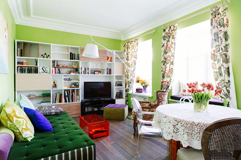 بجرأة باستخدام نظام ألوان غير عادي للستائر ، والجمع بشكل مناسب مع التفاصيل الداخلية ، يمكنك إنشاء تحفة فنية حقيقية للمصممين.