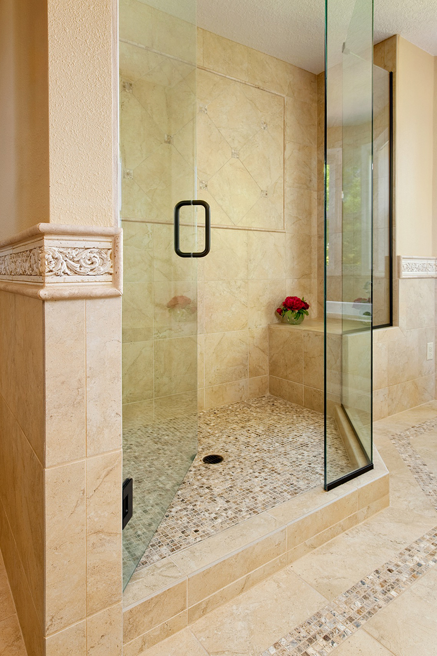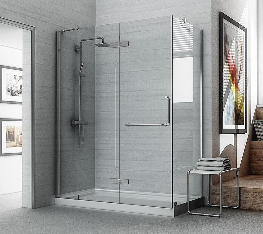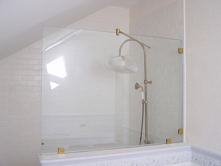 لإنتاج أقسام في الحمام يستخدم الزجاج المقسى ، يعامل كذلك مع طلاء خاص. لأنه يزيد من قوة ومقاومة المواد ، ويمنع تشكيل البقع والفطريات. مثل هذا الزجاج لا ينكسر عن الصدفة ، ومن الصعب كسره عن قصد.