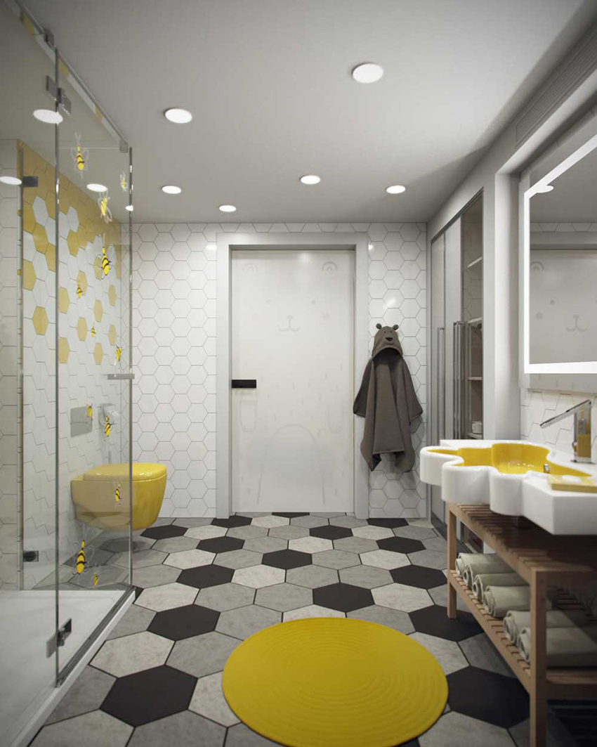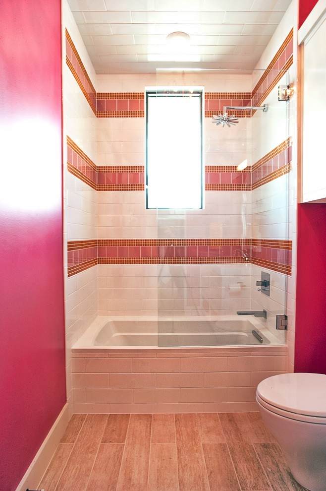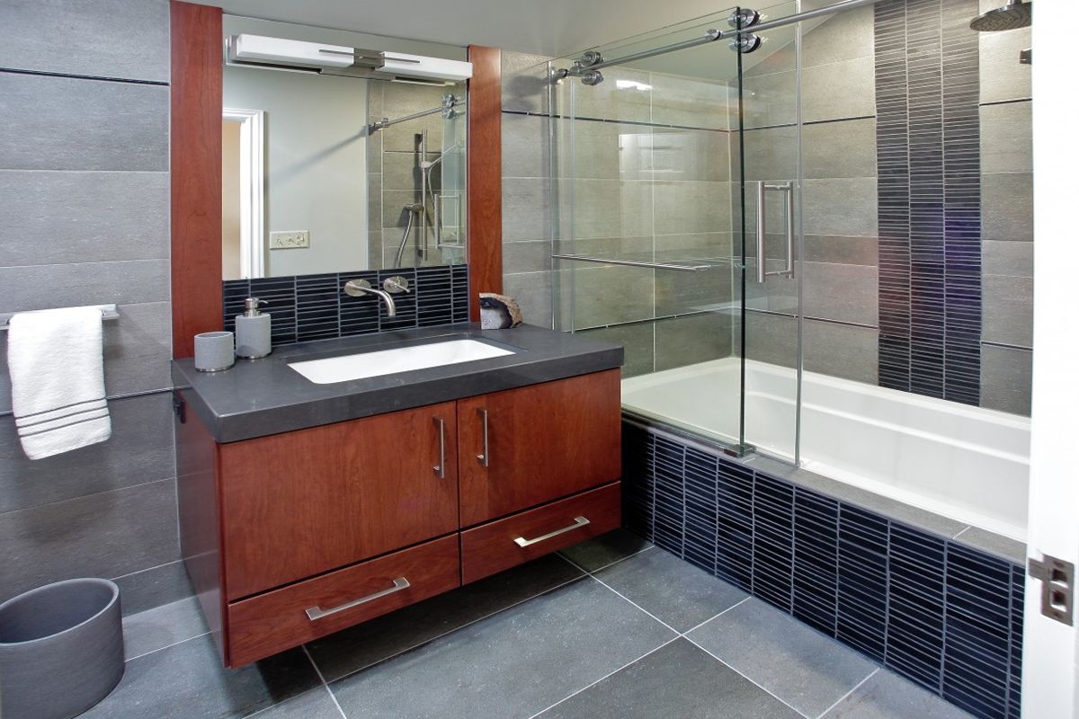 حمام أنيق مع أرفف خشبية وستارة زجاجية مع سطح ملون.
