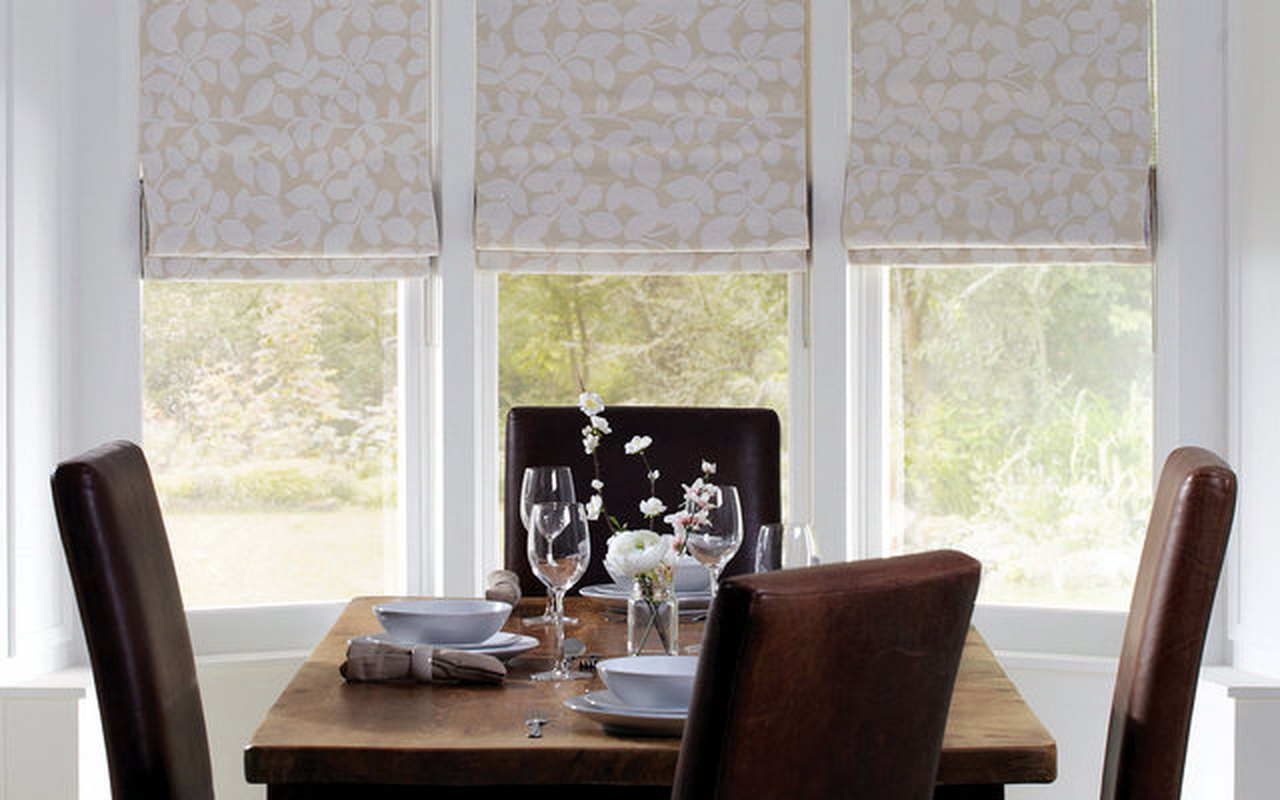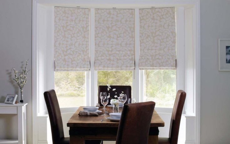 الستائر الدوارة الخفيفة على نافذة الخليج والستائر لتتناسب مع الأثاث.