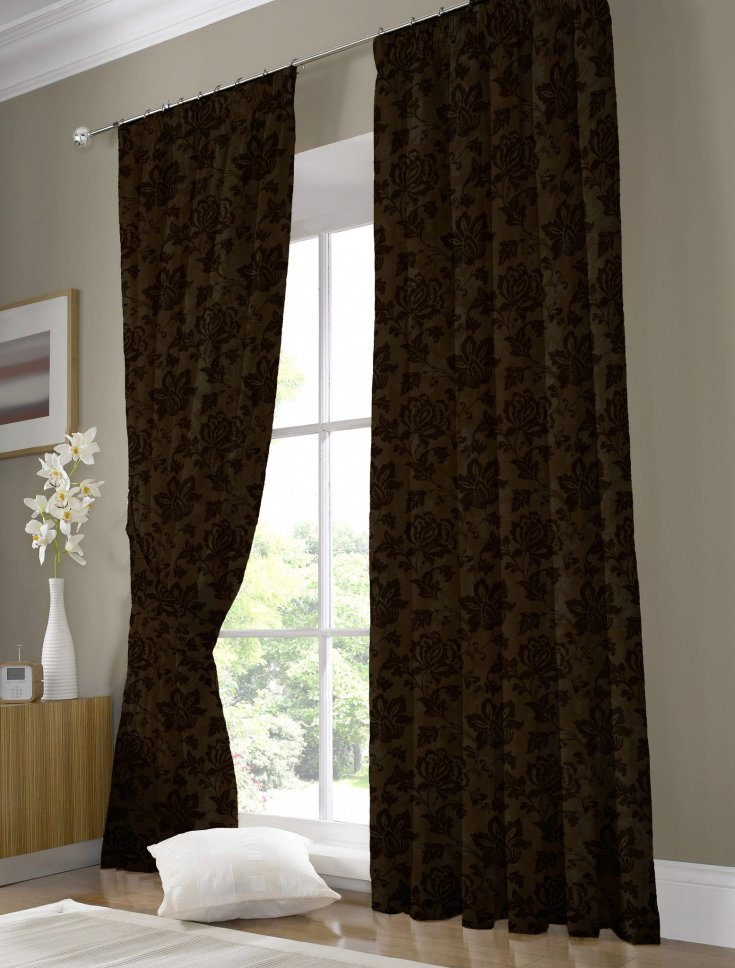 يتكرر مخطط اللون البني للستائر في زخرفة الجدار.