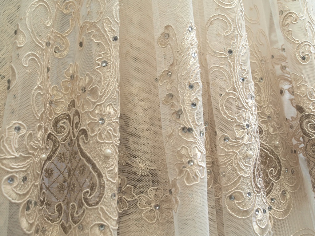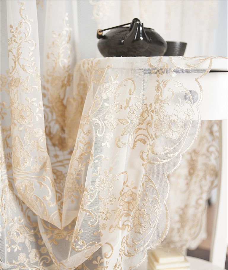 - تول مصقول مع التطريز "ترجيح" الحافة السفلية ، وإعطاء الستائر نظرة ثابتة. يقترح موسم 2018-2019 تزيينه بالخرز والترتر وأحجار الراين للحصول على "وزن" أكبر للحافة السفلية للتول.