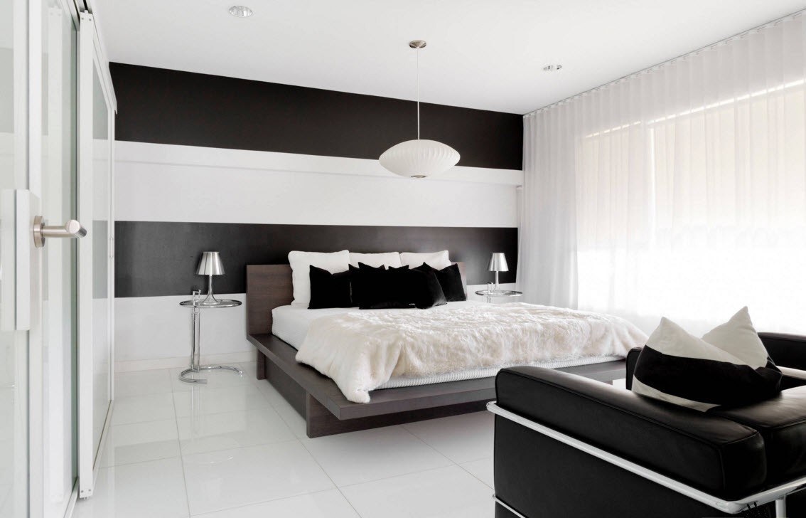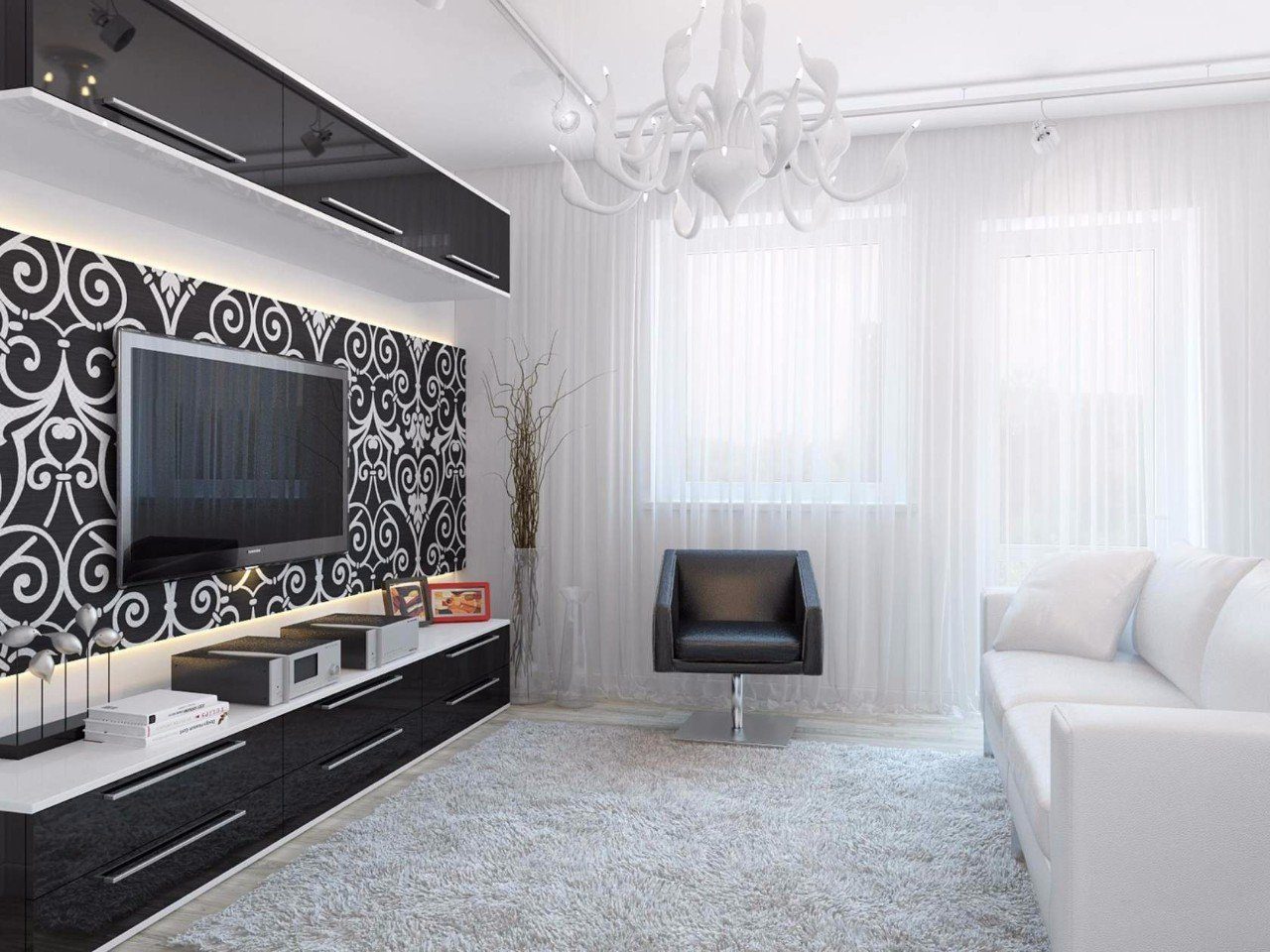 زخرفة النوافذ بالأبيض والأسود في ذروة شعبية. الشيء الرئيسي هو أن تصميم هذه التول مصحوبًا بالتفاصيل الداخلية (الوسائد ، على سبيل المثال) ، وليس "الجدال" مع الأثاث وتزيين الجدران والأغطية الأرضية.