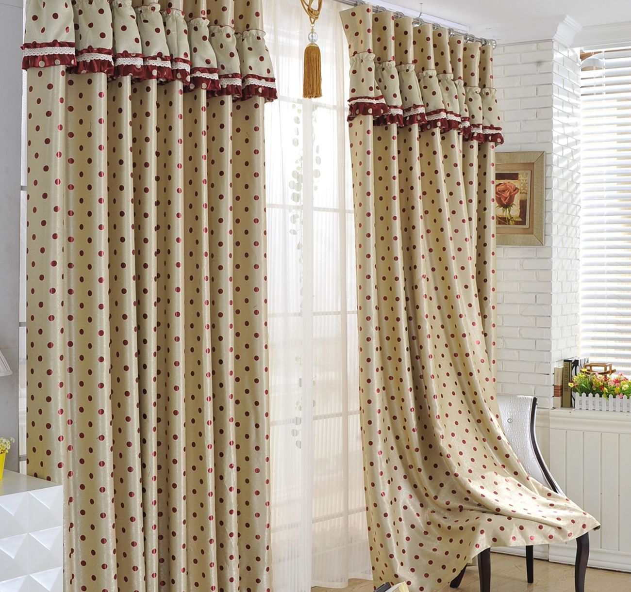 ستارة مزينة بميريز ومكيفة بجديل عريض ستزين الجزء الداخلي لغرفة النوم أو غرفة المعيشة. منذ فترة طويلة ، والكذب على الستائر الكلمة تعطي أنيقة خاصة.