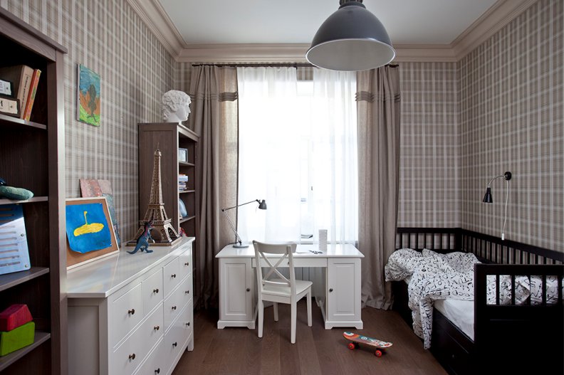 تتوافق ستارة الكتان المشرقة مع نقشها تمامًا مع الستائر الداكنة (كما هو موضح في الصورة) وإطارات لوحات من نفس اللون. يتم اختيار الأثاث أيضا لتتناسب مع.