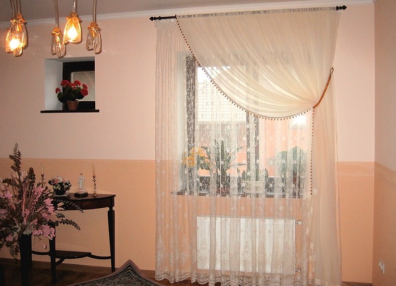 ستقدر نافذة التصميم هذه عشاق البساطة والأناقة. تول الكتان مع التطريز لن تبدو مبتذلة أو alyapisto. لذلك يوصى باستخدام أبسط التصميمات للستائر.