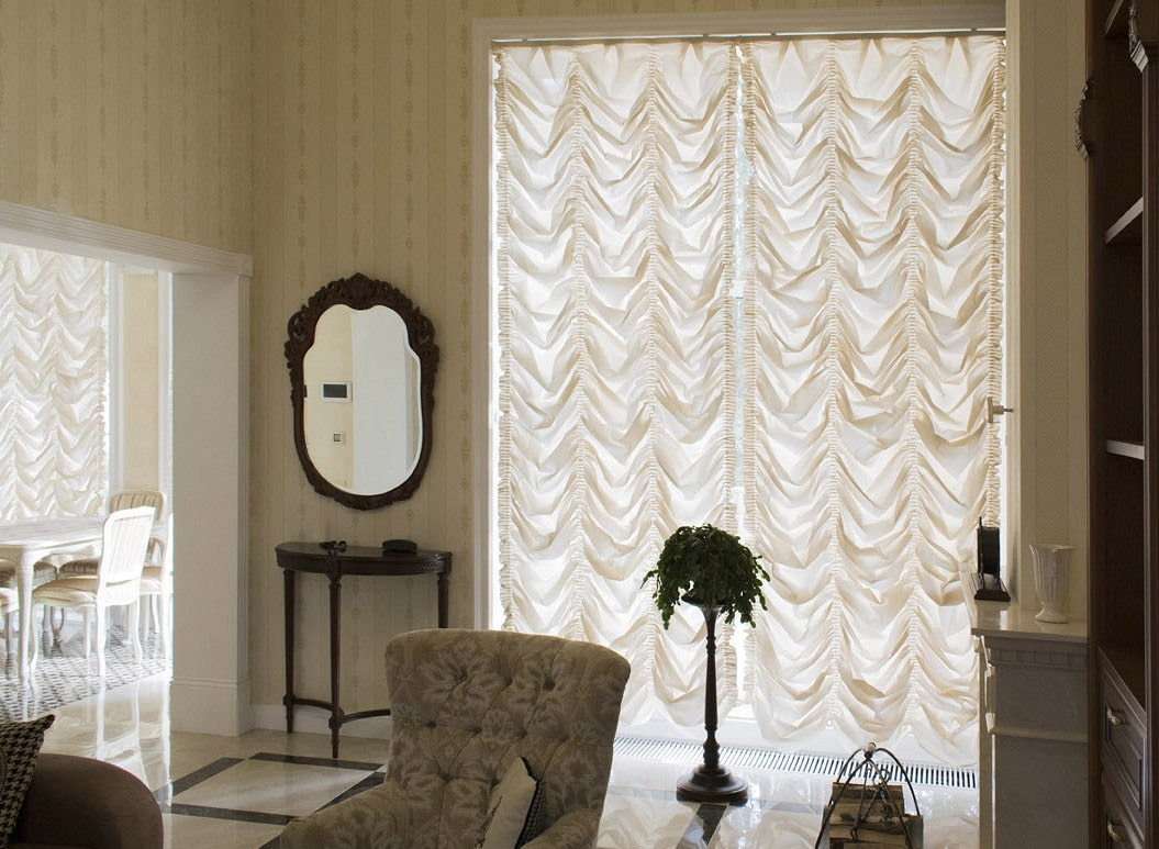 ستستغرق الستائر بطول الأرضية أو اللف الناعم على الأرض.