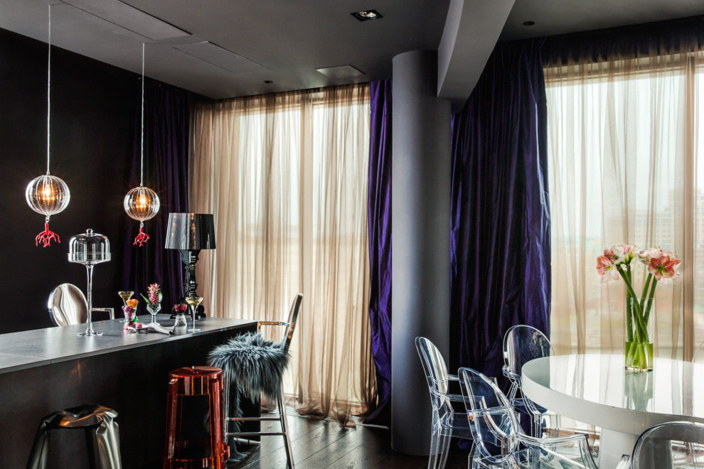 مجلس. كلما كانت ستارة الغرفة أكثر إحكامًا وأغمقًا ، يتم استخدام القماش الأكثر إشراقًا وأخف وزنا ولامعة. حتى الستائر غير اللامعة ذات الألوان الباردة والمظلمة - الأسود والرمادي ، والأخضر الأزرق ، والأرجواني الداكن ، وبورجوندي - سوف تناسب الغرف الطويلة مع العديد من النوافذ المواجهة للجنوب.