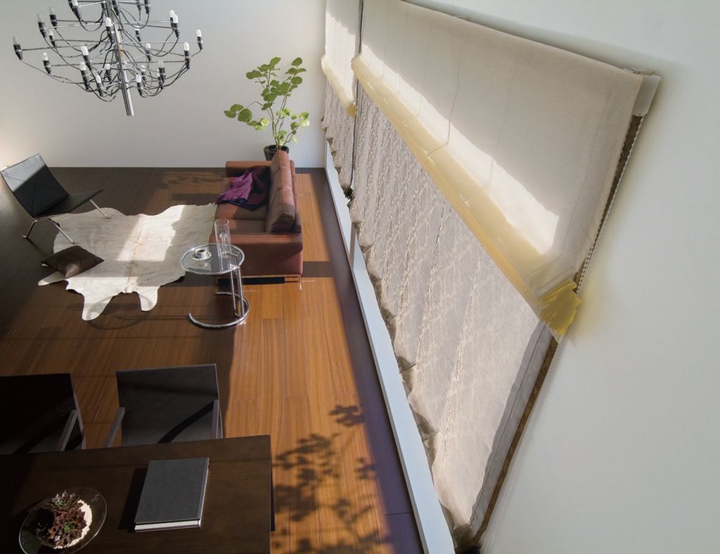 من الخارج ، يبدو تصميم الستائر الرومانية الأوتوماتيكية أكثر بساطة ، نظرًا لأنها تفتقر إلى آليات التحكم اليدوي.