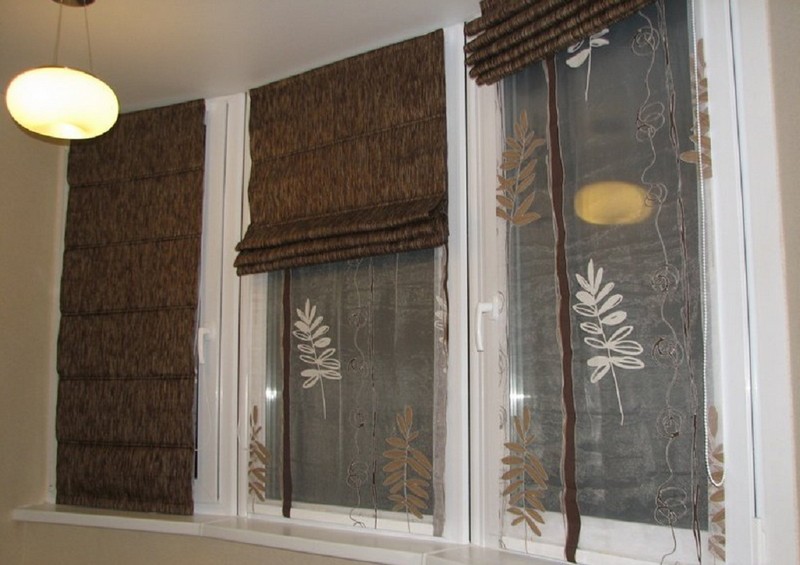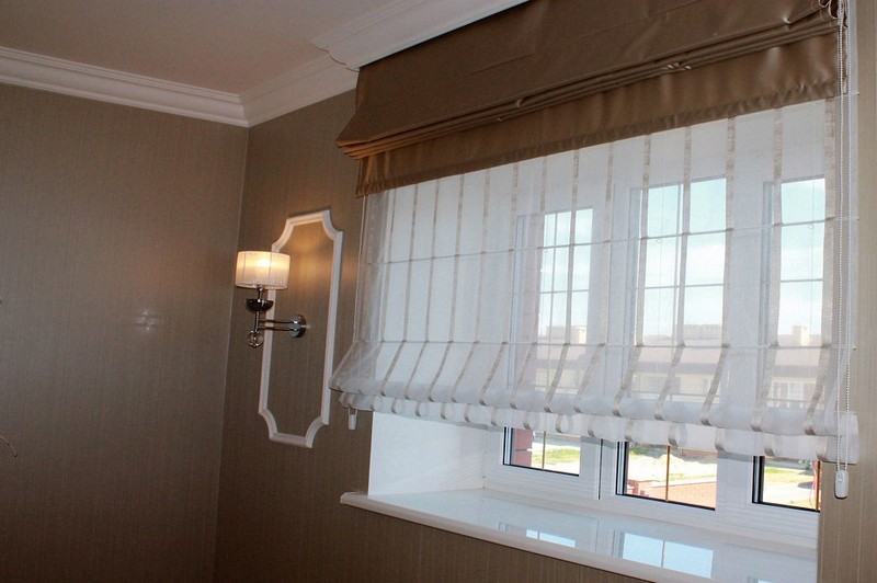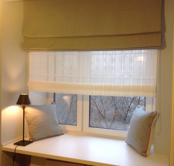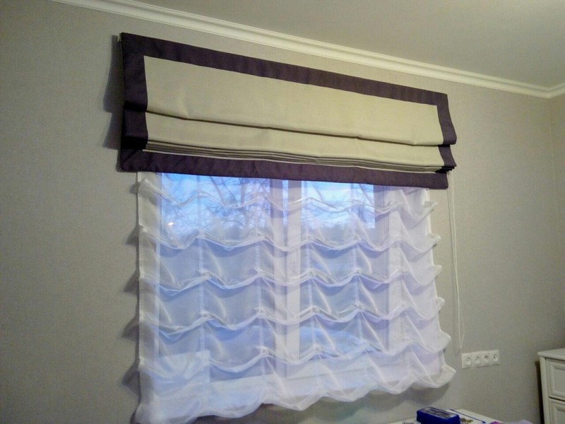 أفاريز صف مزدوج للستائر الرومانية - وهو اتجاه جديد ، حصل على حركة منذ عامين فقط. يشبه تصميم هذه الكورنيش نوع الصف الواحد. لكن الاختلافات لا تزال هناك. لربط الستار الثاني ، يتم استخدام Velcro آخر ، وتقع على الجدار الخلفي لهيكل الشخصية. لرفع / خفض كلا الستائر ، استخدم هيكل عمل واحد - نفس سلسلة التحكم اليدوي. وبحيث هناك إمكانية لتنظيم منفصل لكل ستارة ، فإن نظام التحكم مجهز بمقابس توقف.