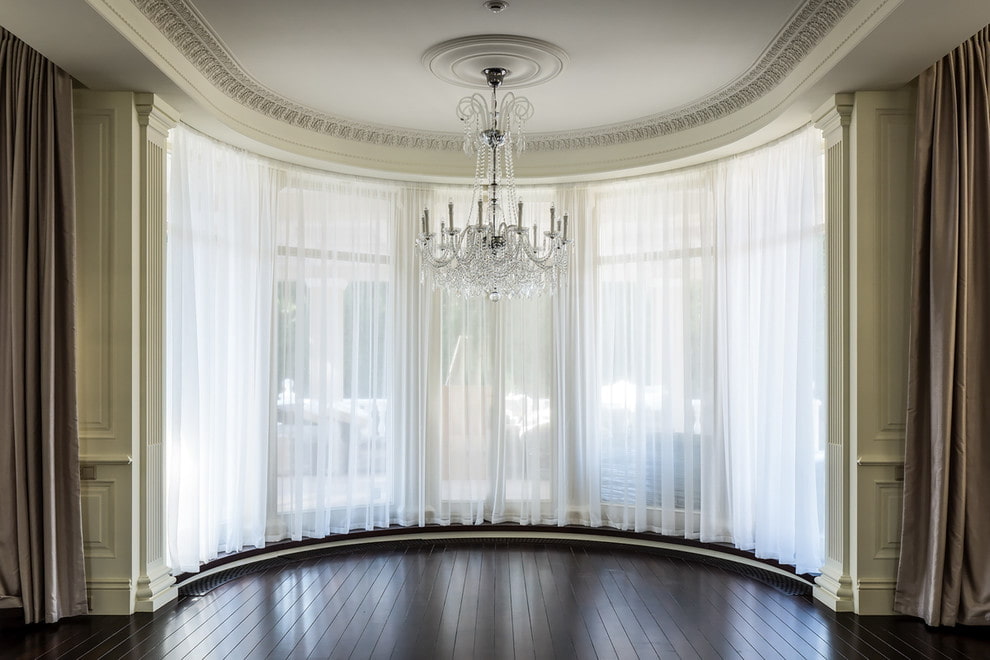 الأفاريز شبه الدائرية مناسبة للستائر من أي نوع من القماش. بفعالية خاصة أنها تبدو في أماكن النمط الكلاسيكي والإمبراطورية.