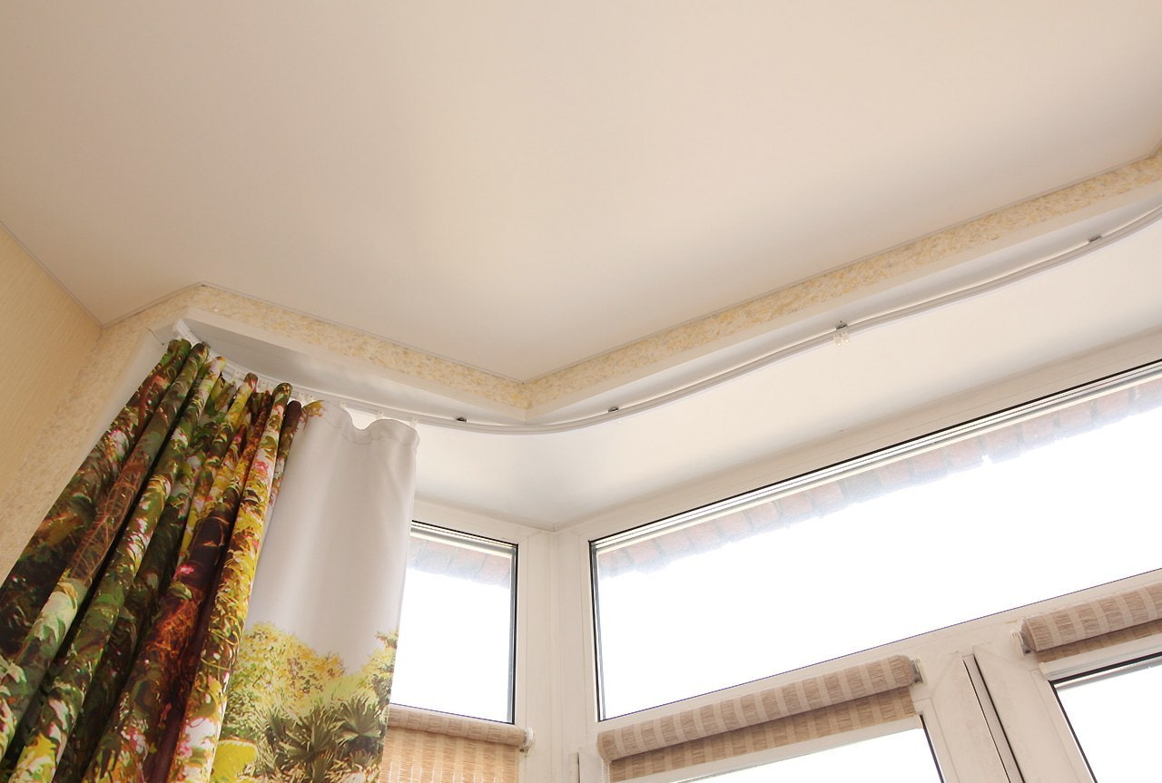 تصميم الطنف على شكل نصف دائرة لا يختلف عن المعتاد - قضيب ، بين قوسين ، نصائح ، حلقات للستائر.