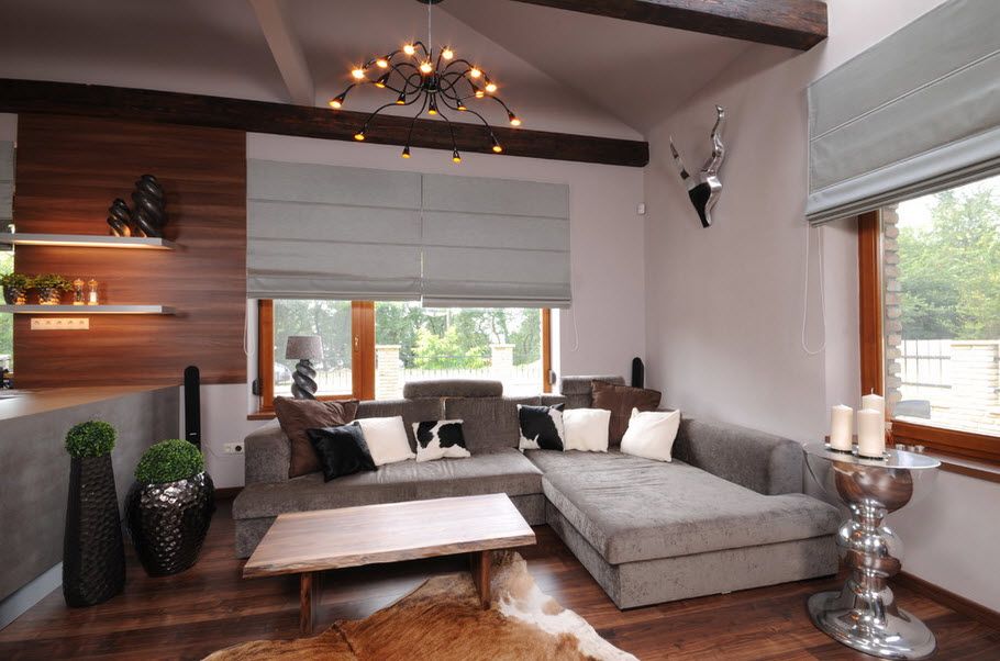 - وبالطبع ، لم يقم أحد بإلغاء الستائر بالرسومات والمطبوعات المعتادة. لن يبرزوا كثيرًا وينظروا بتناغم مع بقية الأجزاء الداخلية من الغرفة.