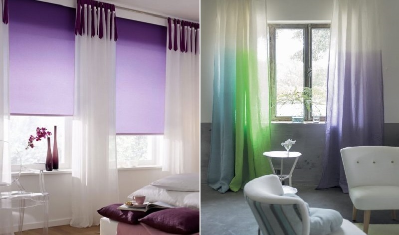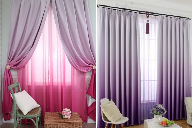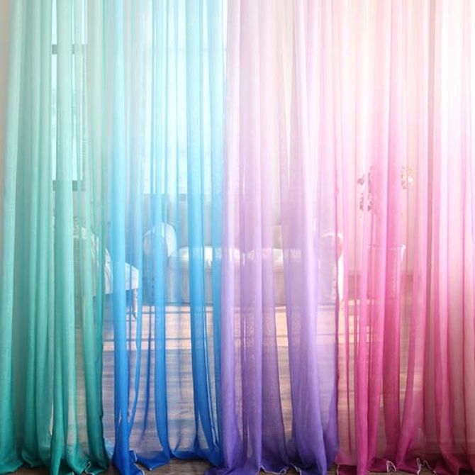 التدرج النسيج هو عمل فني. يخلق اللون الناعم "التدفق" للألوان أجواء مذهلة في أي غرفة ، سواء كانت غرفة معيشة فسيحة أو غرفة نوم صغيرة. هذه الستائر مناسبة للأسلوب الحديث ، التكنولوجيا الفائقة ، الحد الأدنى. على الرغم من ذلك ، بالطبع ، كل هذا يتوقف على سطوع ولون الستائر.