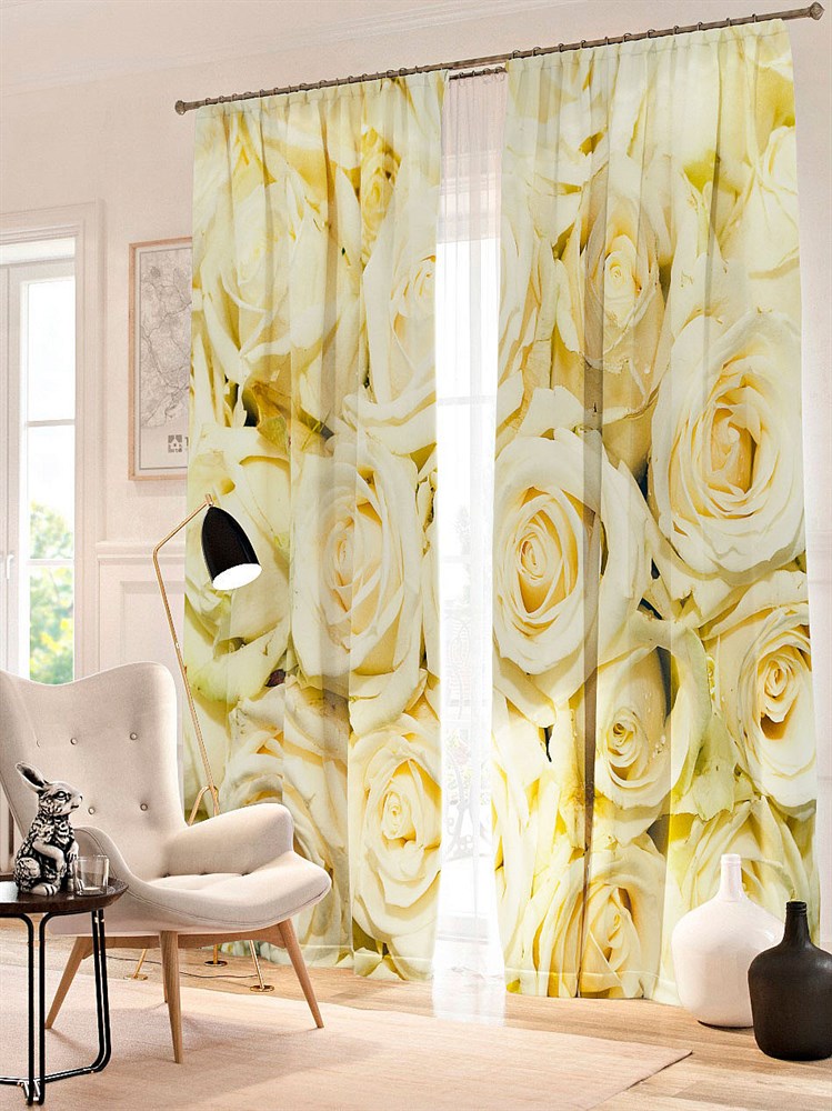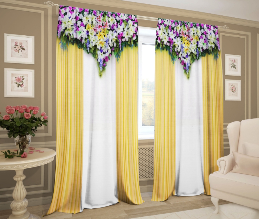 "الاعتراف". اختلاف آخر حول موضوع الزهور. إذا علقت ستارة تحمل الاسم الرومانسي "اعتراف" ، ستظهر على النافذة إكليل جميل من الزهور الصفراء. نظرًا لتصميم الأزهار ، سيكون هذا النوع من المنسوجات مناسبًا في غرفة المعيشة وغرفة النوم.