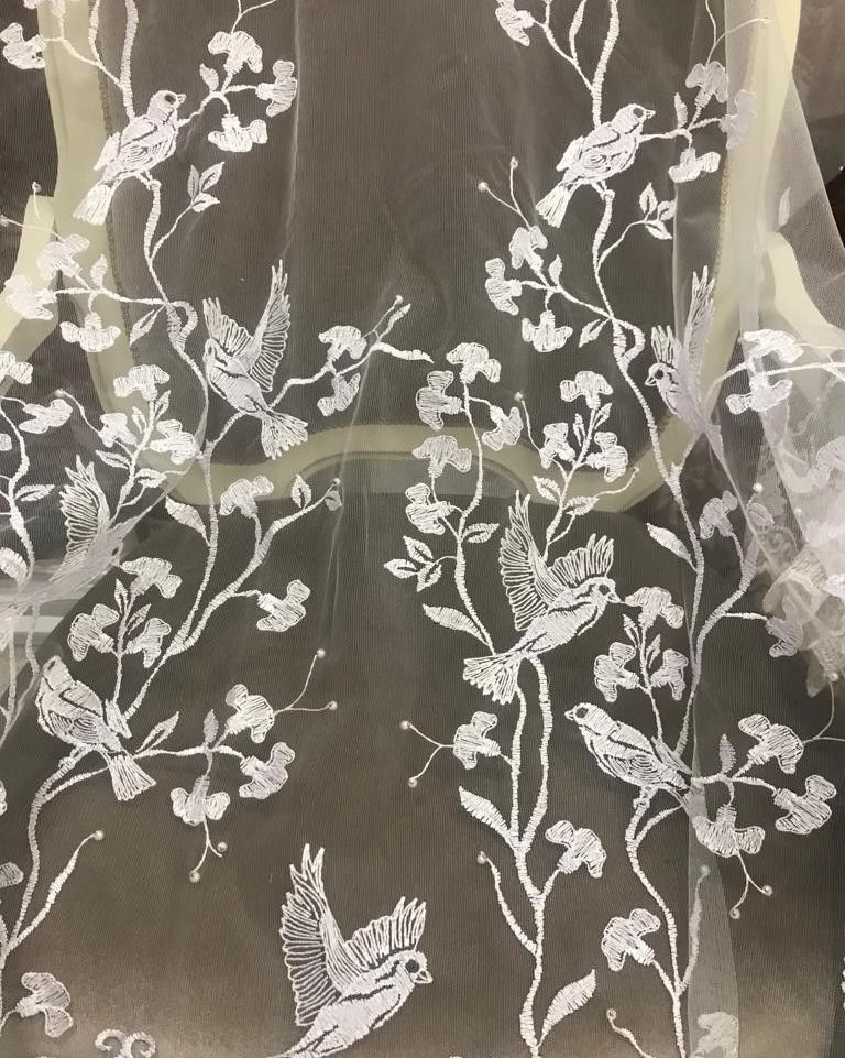 التطريز على تول مصنوع من خيوط بلون قماش أو تباين ؛ نسيج ناعم أو محدب ممكن.