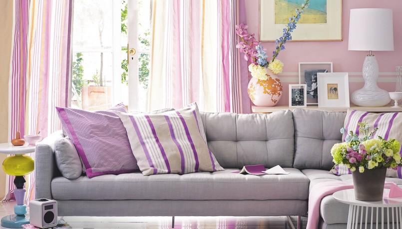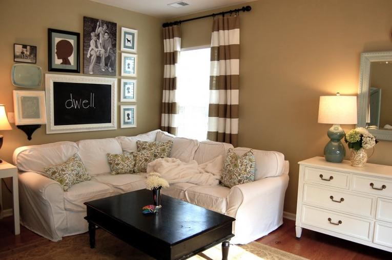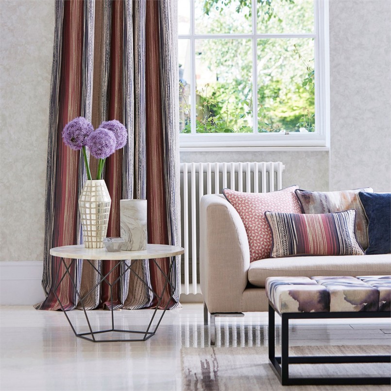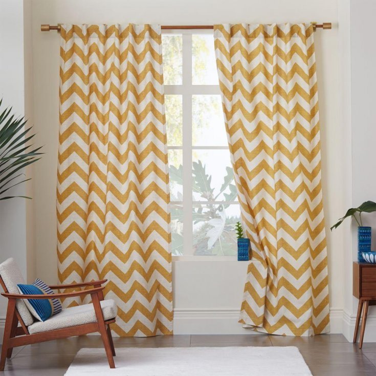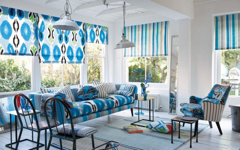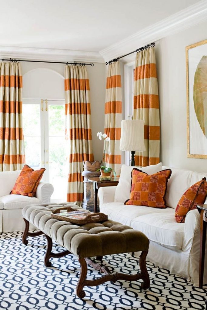 ستعمل الخطوط الأفقية على الستائر على جعل غرفة المعيشة أوسع بصريًا.