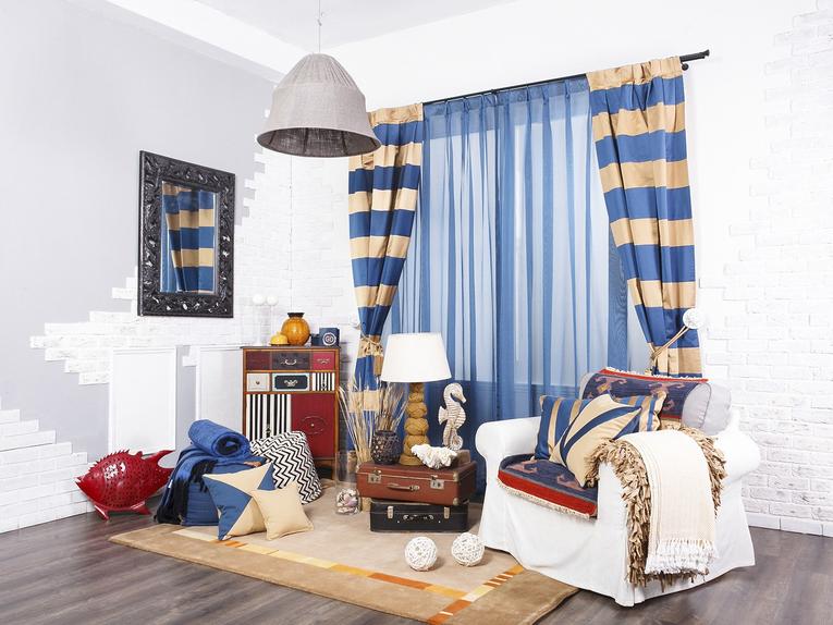 لطيفة للغاية في غرفة المعيشة تبدو مجموعات من الستائر مخططة والستائر منقوشة. النظر في خيار تنظيم مساحة النافذة مع ستائر زرقاء وبيضاء مخففة مع تول حليبي بألوان زرقاء محكم عليها. هذا الحل سيكون مثيرا للنظر في نافذة الزاوية المزدوجة.