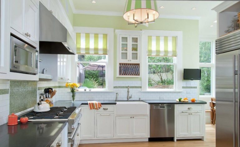 يحتوي المطبخ على الكثير من الروائح والدخان الناجم عن القلي بالزيت ، لذا عليك أن تولي اهتمامًا كبيرًا لاختيار القماش. المواد الكثيفة هي ميزة هنا. أيضا اختيار نوع الستار له أهمية كبيرة. إيلاء الاهتمام لمنتجات لفة أو الستائر الرومانية الشريط الأفقي. هنا أيضا تأتي الخلية الإنجليزية التقليدية.