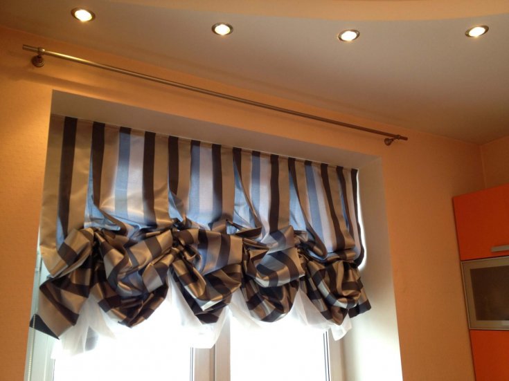 ستائر قياسية مستقيمة ، تكملها ستارة شفافة ، مناسبة أيضًا. يبدو هذا التصميم مثيراً للاهتمام إذا كان المطبخ به نافذة كبيرة أو شرفة أو لوجيا.