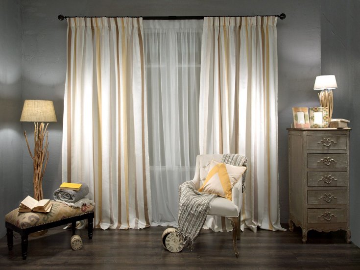تصميم الشقة والمنزل الخاص مع استخدام المنسوجات نافذة مخطط - اكتشاف فريد لمحبي الكلاسيكية. ليس من الضروري أن تأمر portieres ضخمة. تناسب تول رشيقة في قطاع من قطع شفافة ، وجعل تقاطع أفقي.