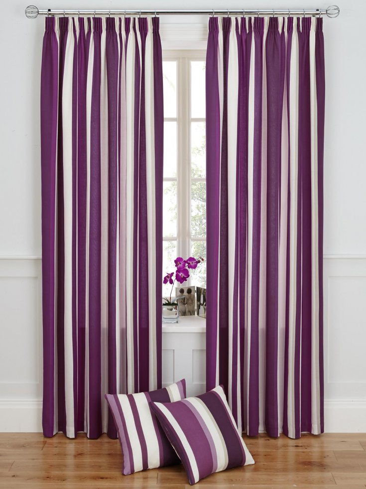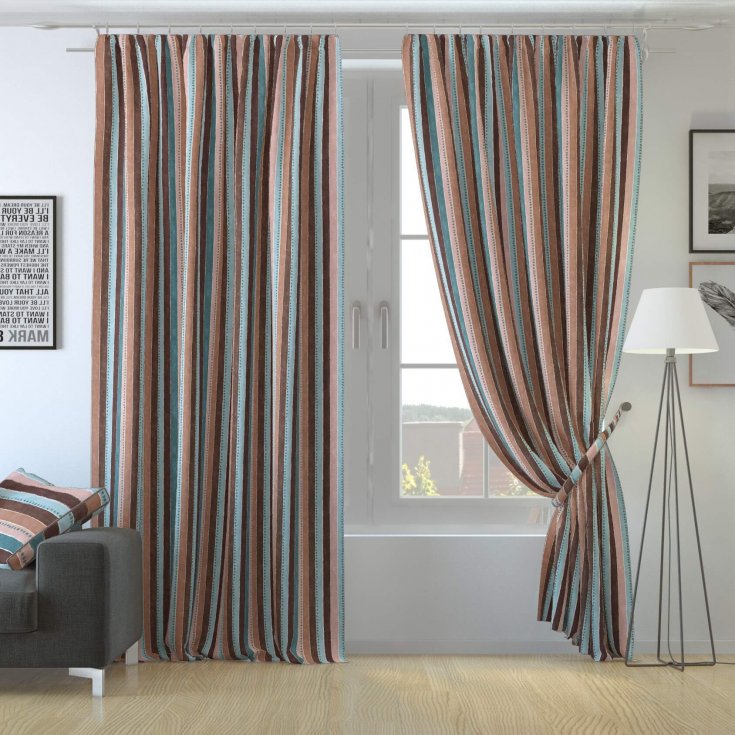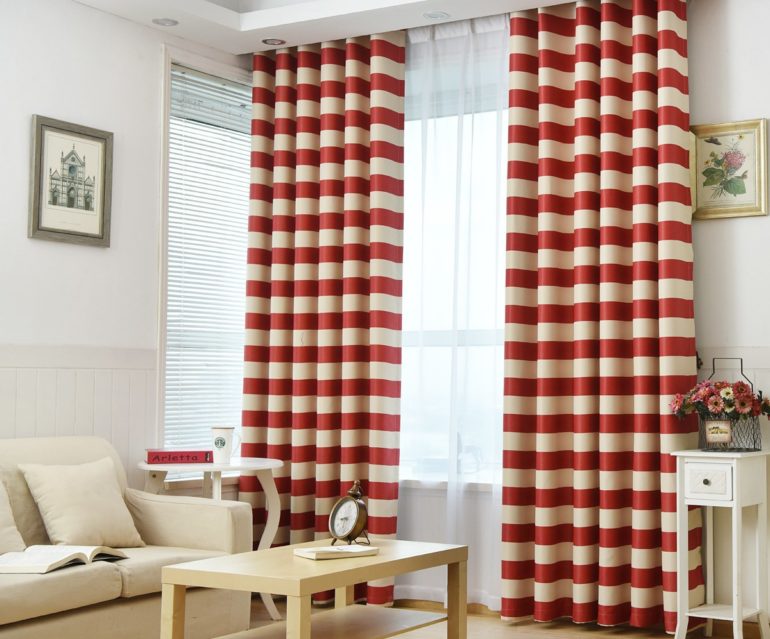 يمكن للستائر المخططة أن تزيد حجم الغرفة بصريًا. على سبيل المثال ، إذا لم تكن تدفقات الشقق عالية جدًا (حتى 2.2 متر) ، فسيكون من الضروري زيادة هذا المؤشر ، وإن كان ذلك بصريًا. لهذا ، يتم استخدام خطوط ضيقة عمودية.