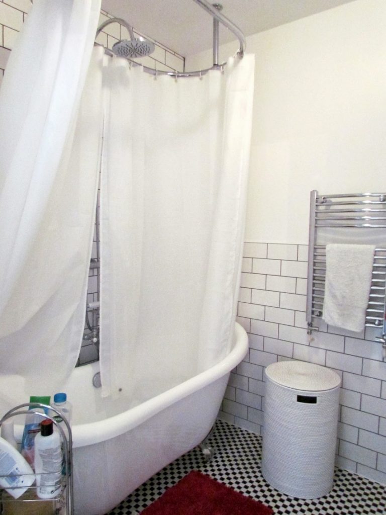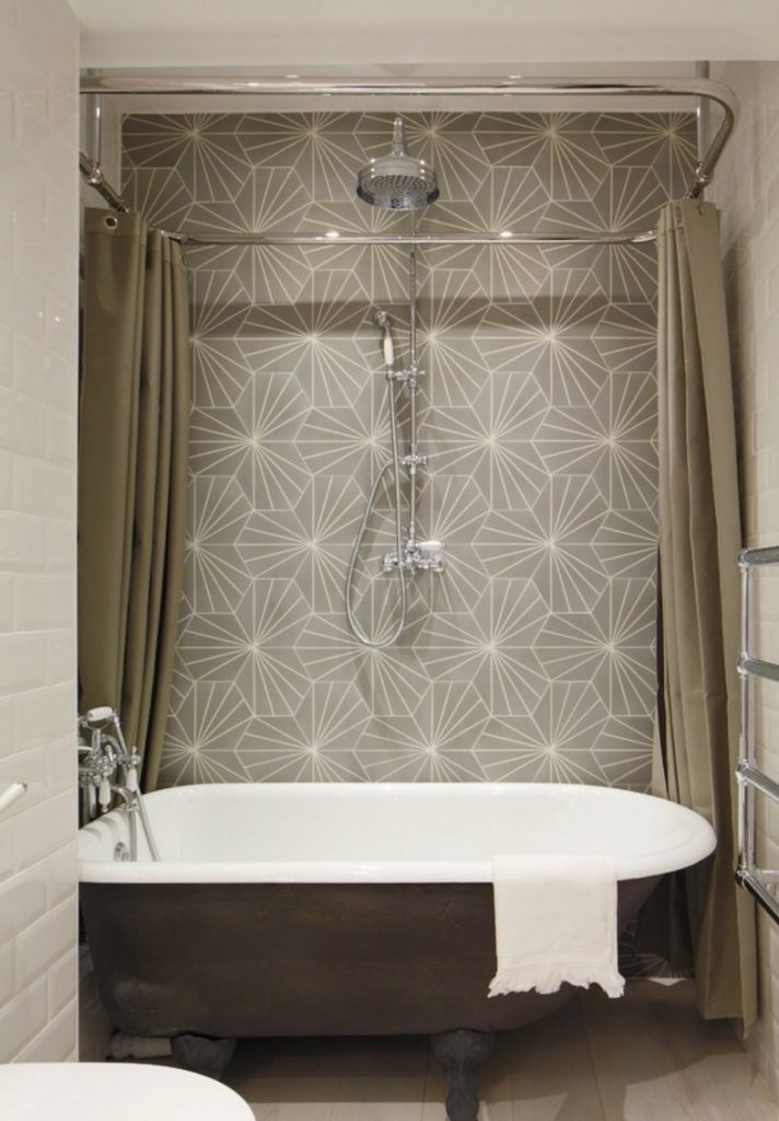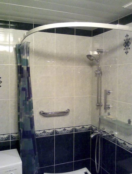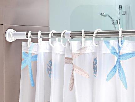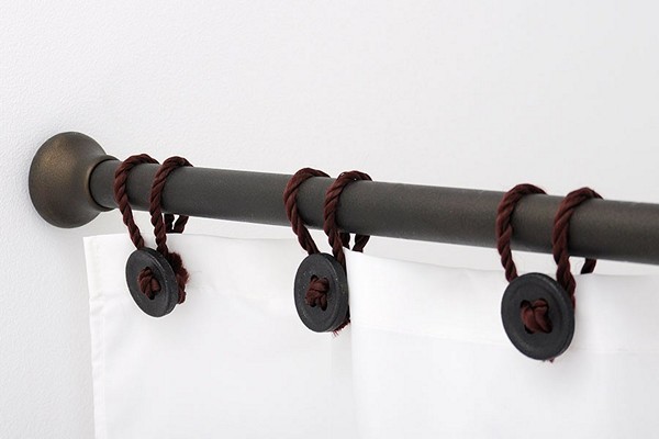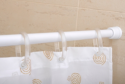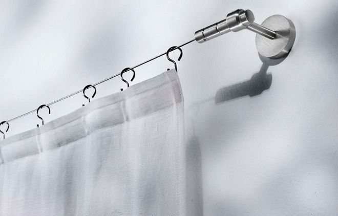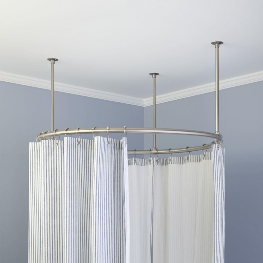 يتم تعليق الستار على حلقات القطر المطلوب. باستخدام ستارة دائرية ، يمكنك صنع ستائر على كلا الجانبين - نموذجية للحمامات التي يبلغ طولها عدة سنتيمترات من الحائط. وبالتالي ، ستقتصر المياه على الستائر وتدفق بهدوء في الحمام.