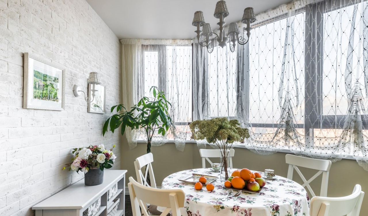 الستائر الدوارة رائعة لتزيين النوافذ البانورامية على شرفة منزل ريفي.