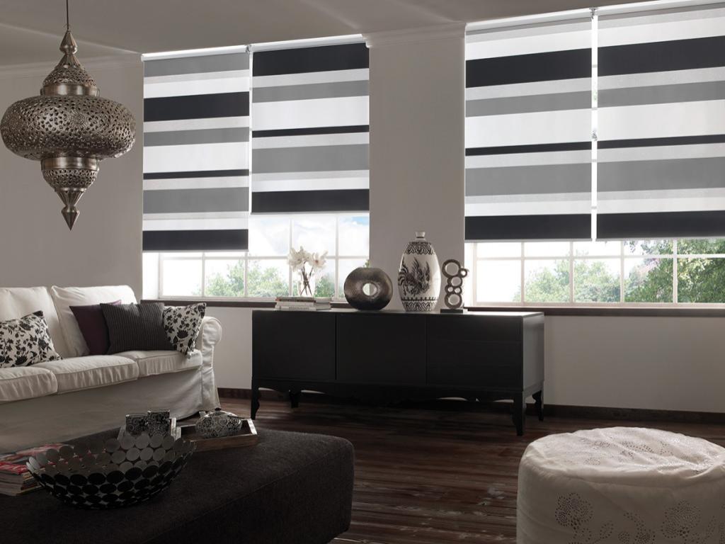 - الستائر "نهاراً وليلاً" - مزيج من أشرطة شفافة ومشرقة من القماش (تنظيم درجة سواد).