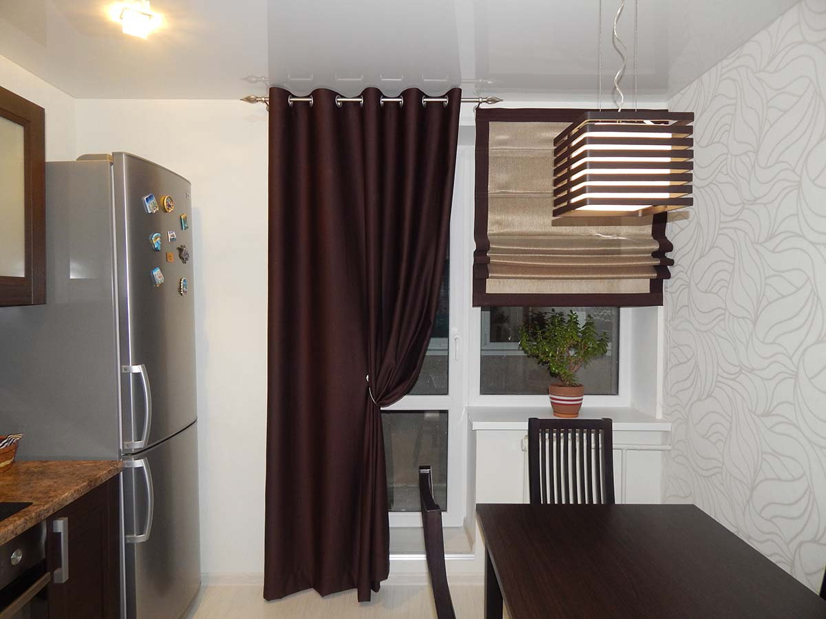 للمطبخ هو الأنسب ، ستائر قصيرة كثيفة. لا تسكع تحت قدميك ، ولا تجمع الأوساخ على الأرض.