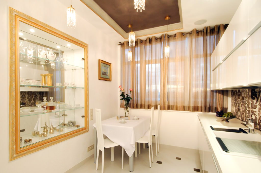 - سيتم تزيين المطبخ الواسع بشكل جميل مع ستائر متعددة الطبقات ، ثم في وسط الغرفة سيتم تكوين حصة إضافية من المساحة.