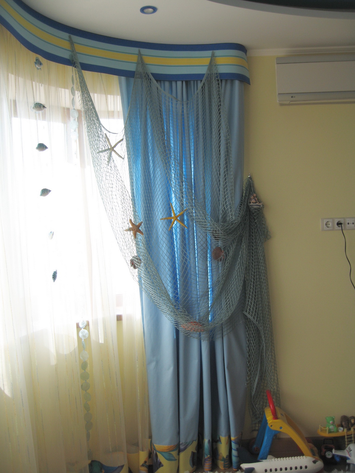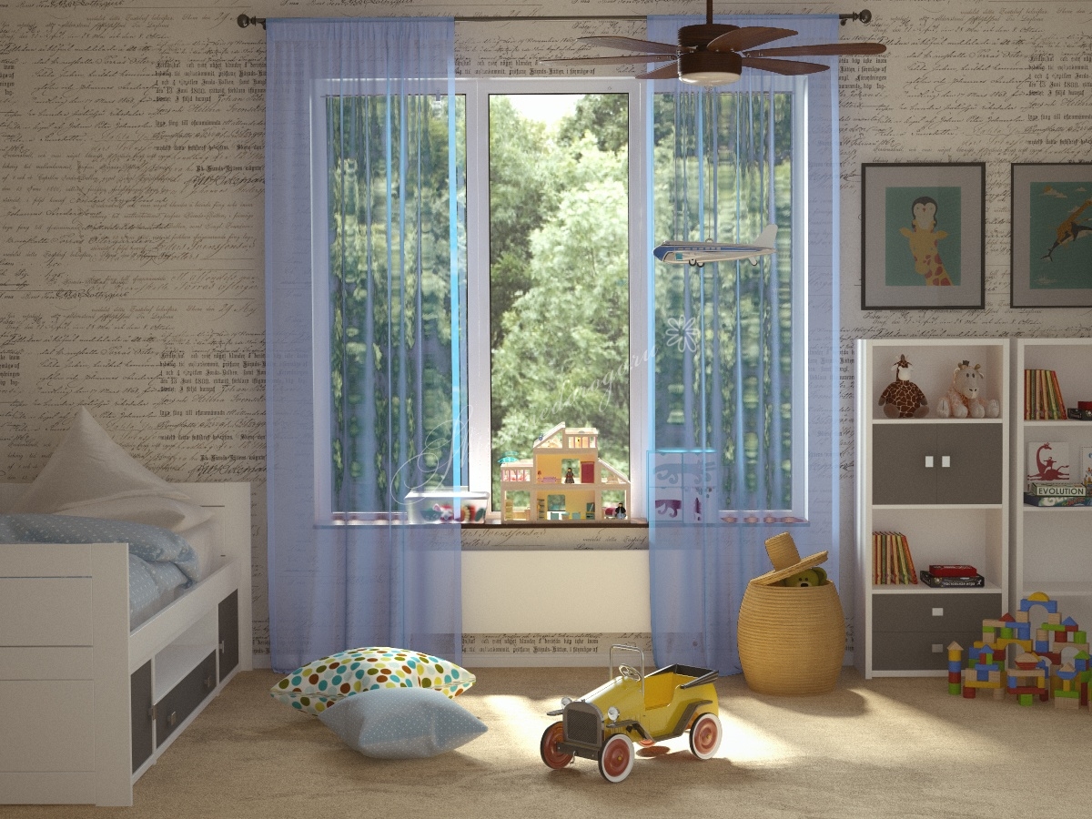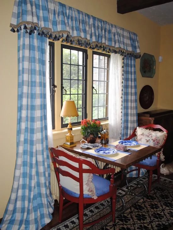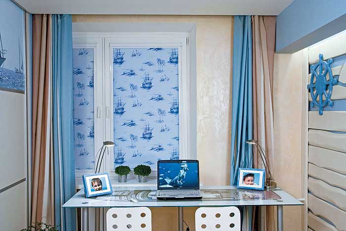 عند تزيين النوافذ ، يستخدم اللون الأزرق بظلال مختلفة ويكمله الستائر الدوارة لتغميق الألوان