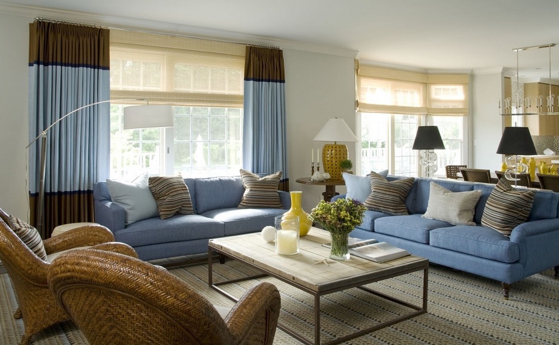 استخدام الستائر الزرقاء في المناطق الداخلية لغرفة المعيشة وغرفة النوم