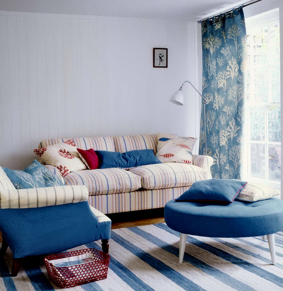 يمكن تصميم مقصورة داخلية أكثر تواضعا مع المنسوجات والأثاث الأزرق بلون الخشب الطبيعي ، أما بالنسبة للستائر ذات اللون الأزرق الفاتح ، فقد يكون الأثاث المصنوع من الخشب الفاتح مناسبًا للخشب الداكن على التوالي.