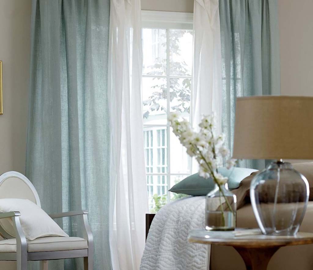 ستائر السماء الزرقاء ذات التصميم الكلاسيكي ملائمة دائمًا وتبدو متجانسة في غرفة النوم الفسيحة