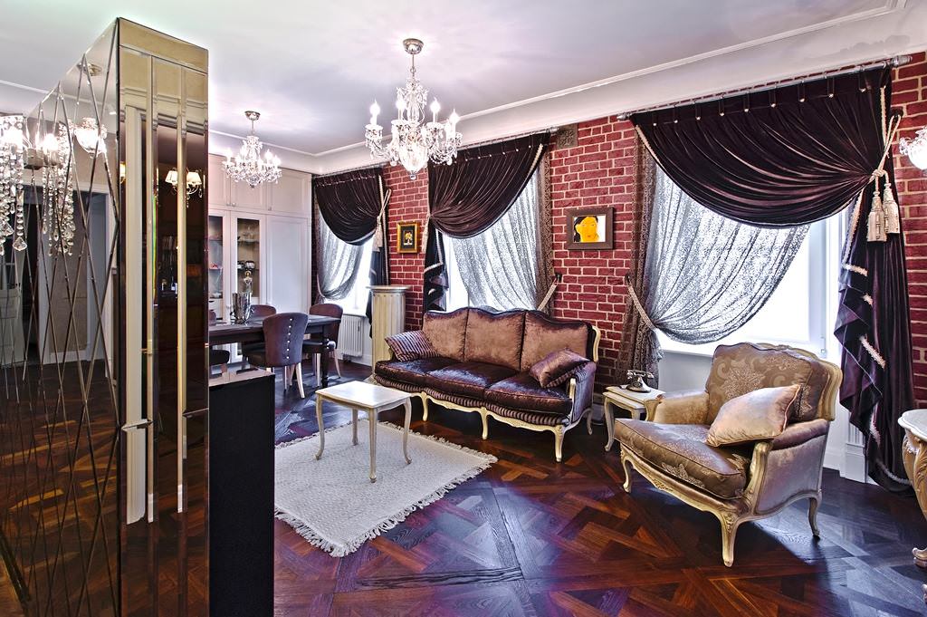 القاعة. الستائر الضخمة واضحة ، كثيفة الملمس وغنية بالمنسوجات المناسبة لقاعة فسيحة. يُسمح بالتنقيط والتفاصيل الزخرفية هنا: فرش ، مسامير ، pelmets ، طيات والتجمع الخصبة.