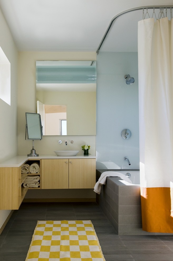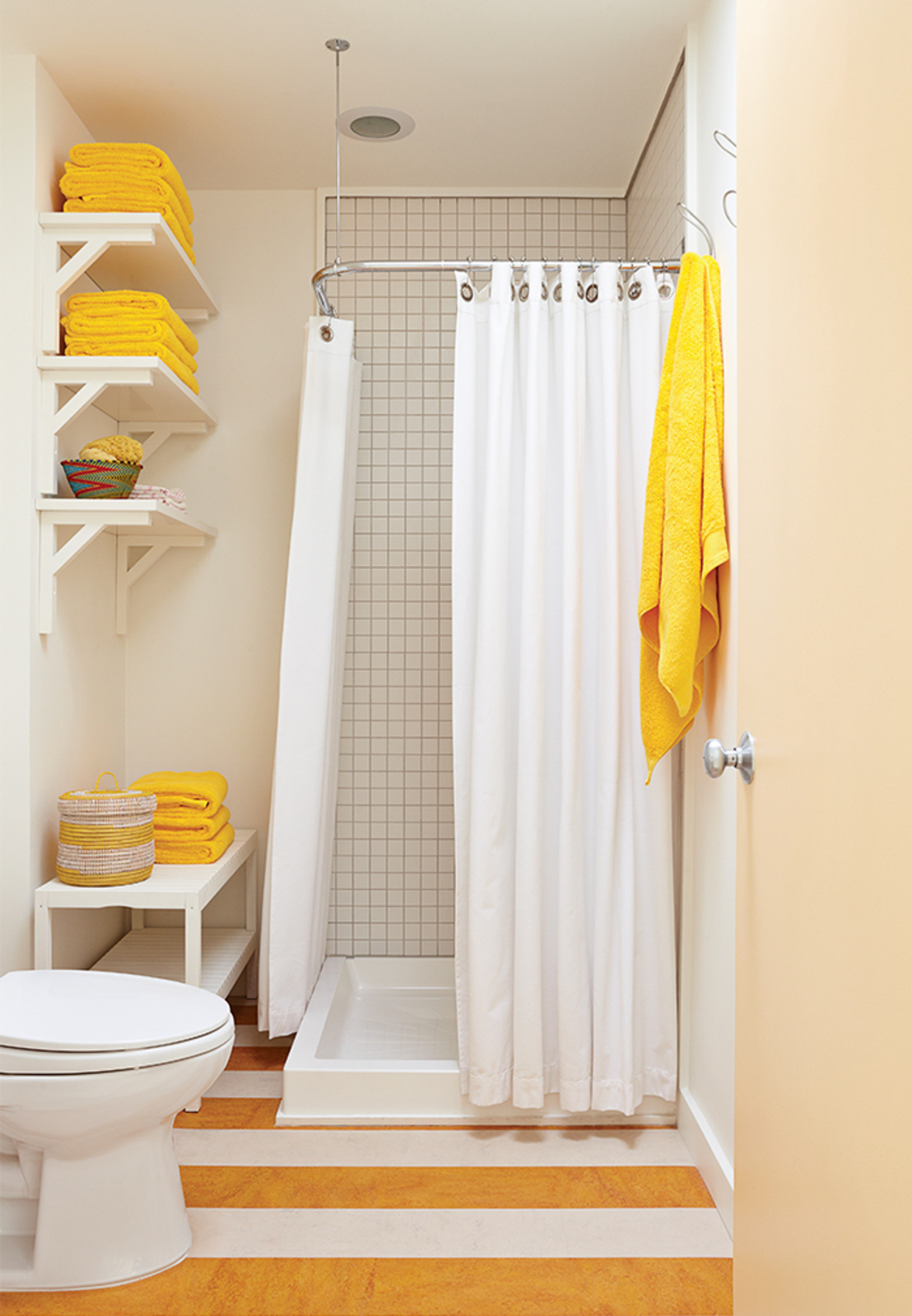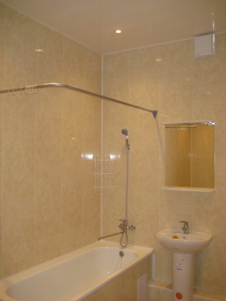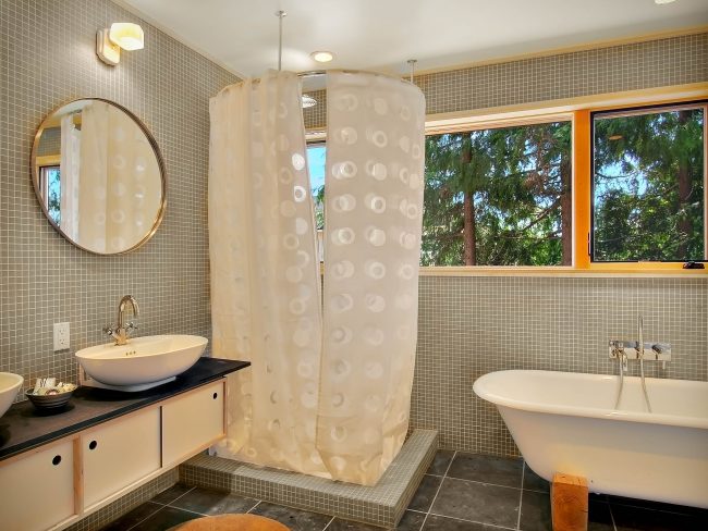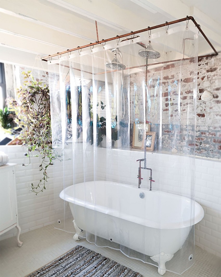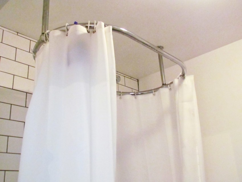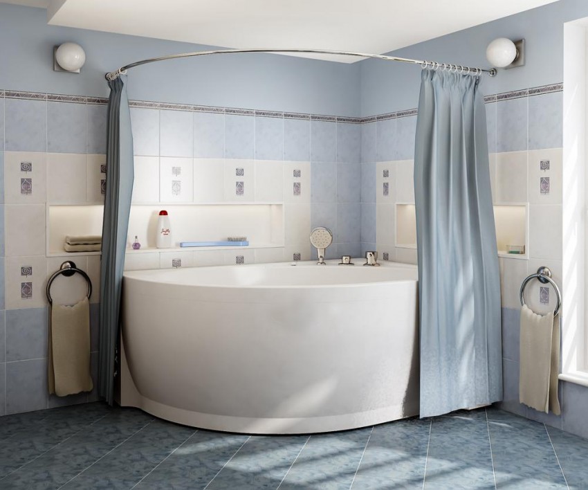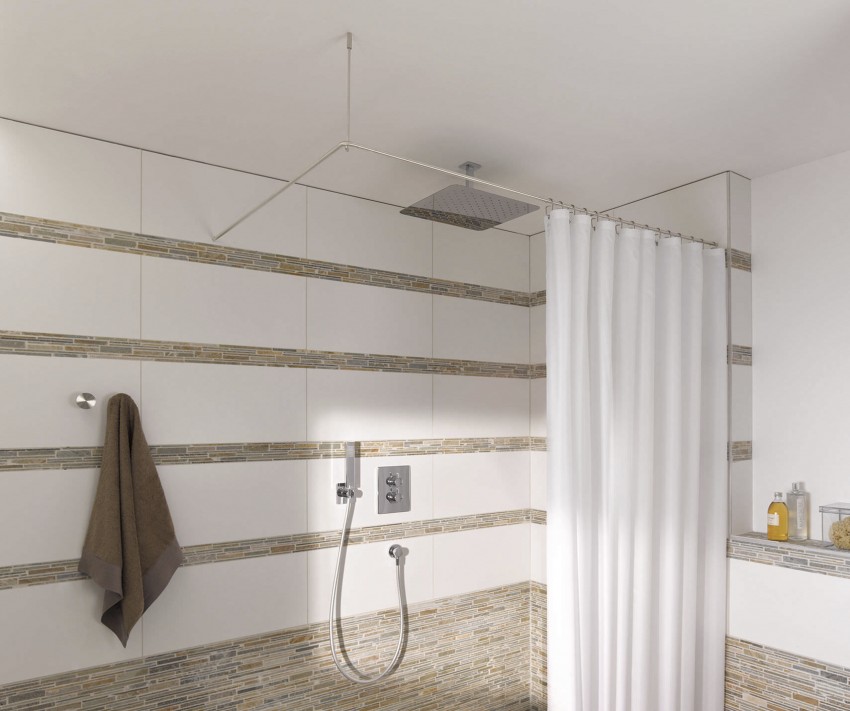 في الحمامات بدون رفاهيات ، غالبًا ما يكون هناك عارضة مستقيمة مثبتة للستائر وأداء دور عملي بحت - إغلاق الجدران والأرضية من البقع.