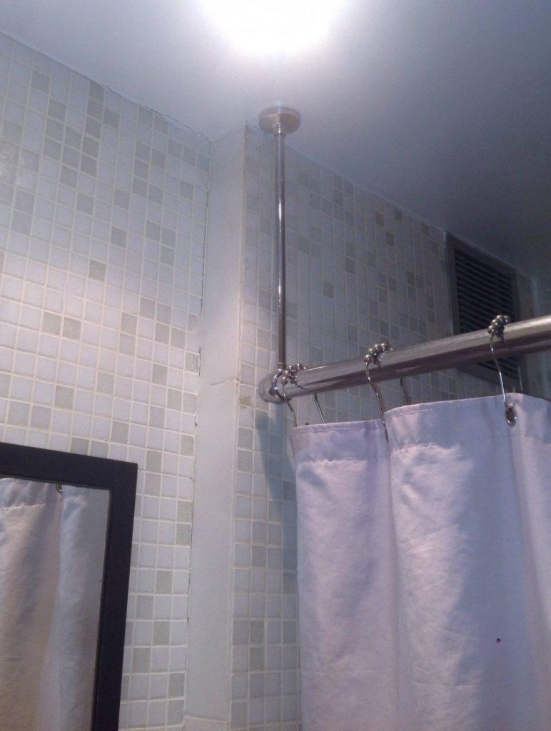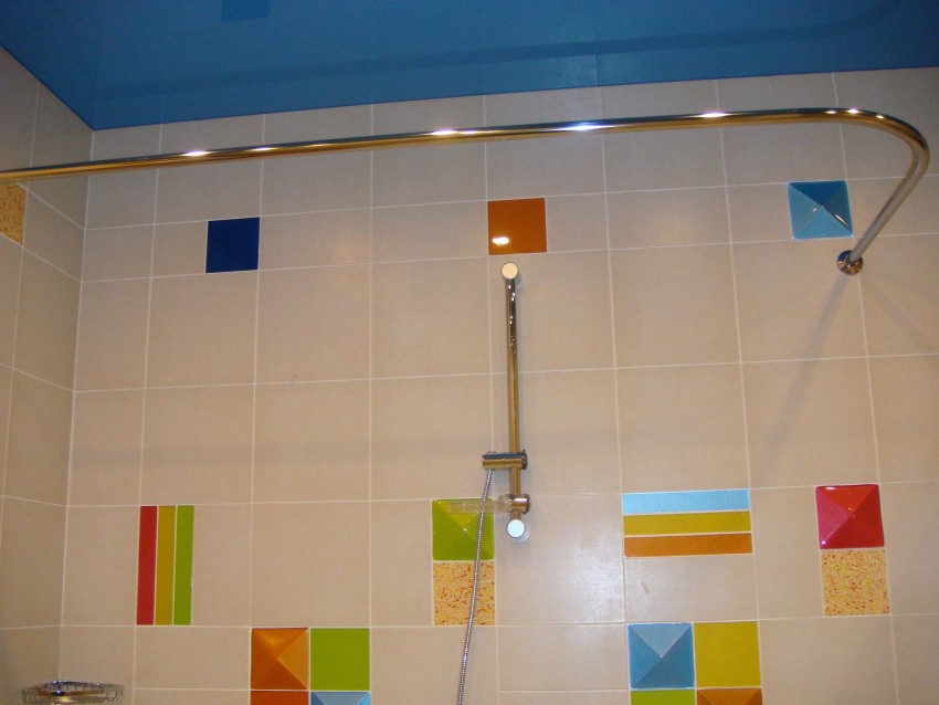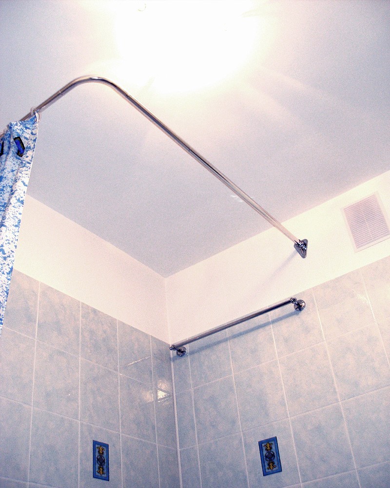 يتم تثبيت قضيب الستارة في زاوية الحمام على عدة أو تعليق واحد - لذلك سيكون التصميم في وضع ثابت ، ولن ينحسر تحت ثقل الستائر المتحركة. لا تصاعد العلوي ، إذا كان نوع التوتر سقف الغرفة.