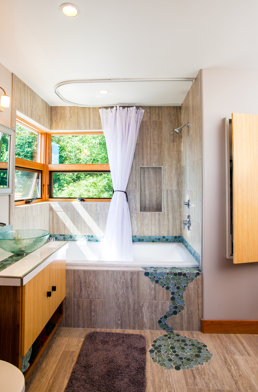 في الحمامات غير القياسية ذات الحمامات المصممة ، من الصعب العثور على قضبان الستائر المعتادة - لن تؤدي وظيفتها العملية بالكامل. لذلك ، عند تصميمهم باستخدام العارضة المنحنية - نصف دائري أو مع عدة الانحناءات. من المهم أن لا تدوم الحلقات الممدودة لتحريك الستائر على المنعطفات من الأنبوب ، ولكن تمر بحرية عبر قسم الإغاثة.