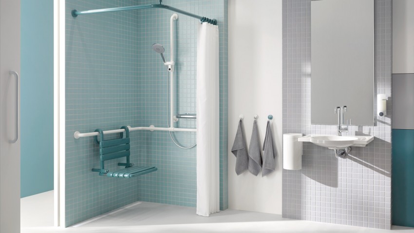 تُعد قضبان نصف دائرية مناسبة تمامًا عند تثبيت حمام به محيط خارجي مجعد في الزاوية.