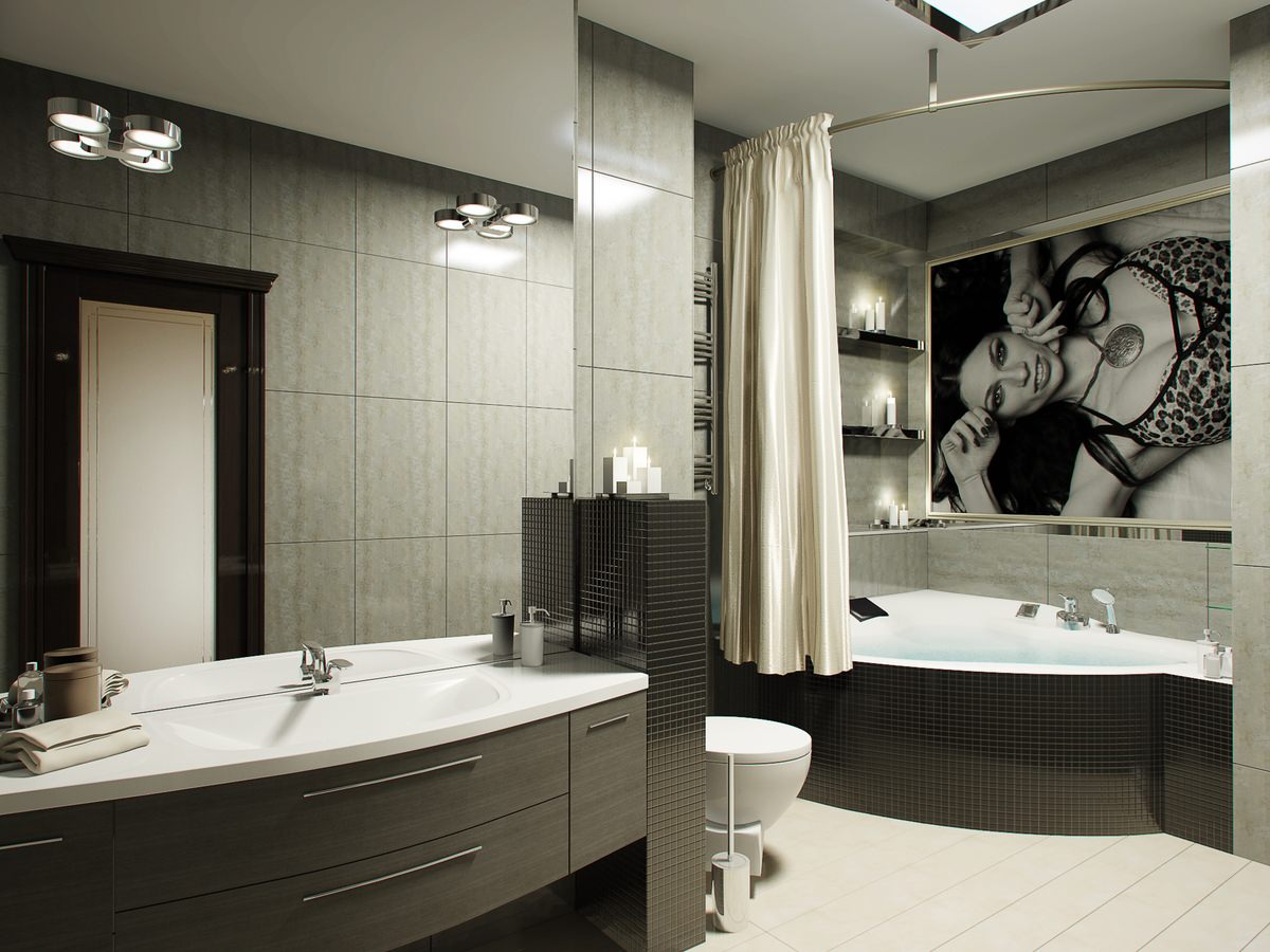 بمساعدة الستائر ، يمكنك بسهولة تحويل الجزء الداخلي من الحمام.