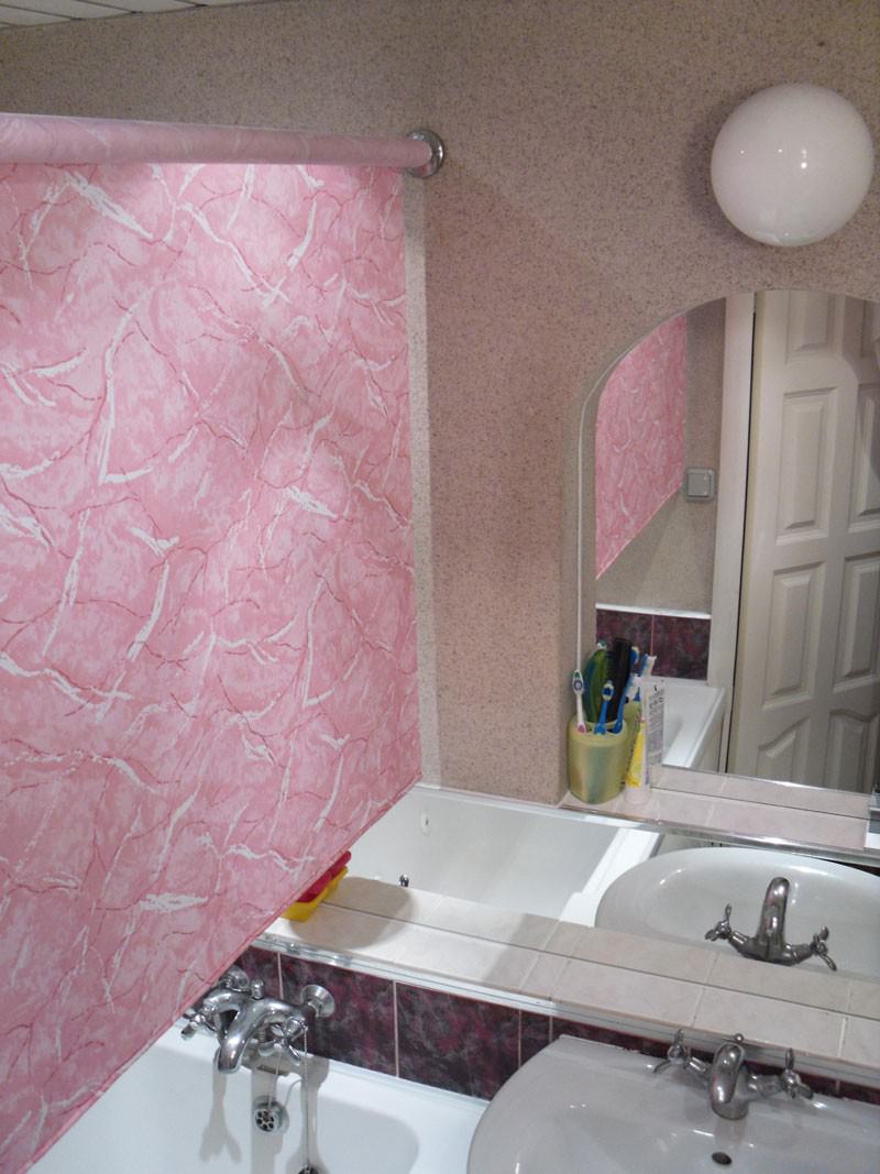 ستائر النسيج تبدو جيدة في التصميم الكلاسيكي للغرفة. الطيات الناعمة للنسيج تكمل بصريا الكائن المحدد - في هذه الحالة ، الحمام. كما يتم الجمع بين الستائر النسيجية مثل "بلد" أو "بروفانس" بنجاح مع تصميم مماثل.