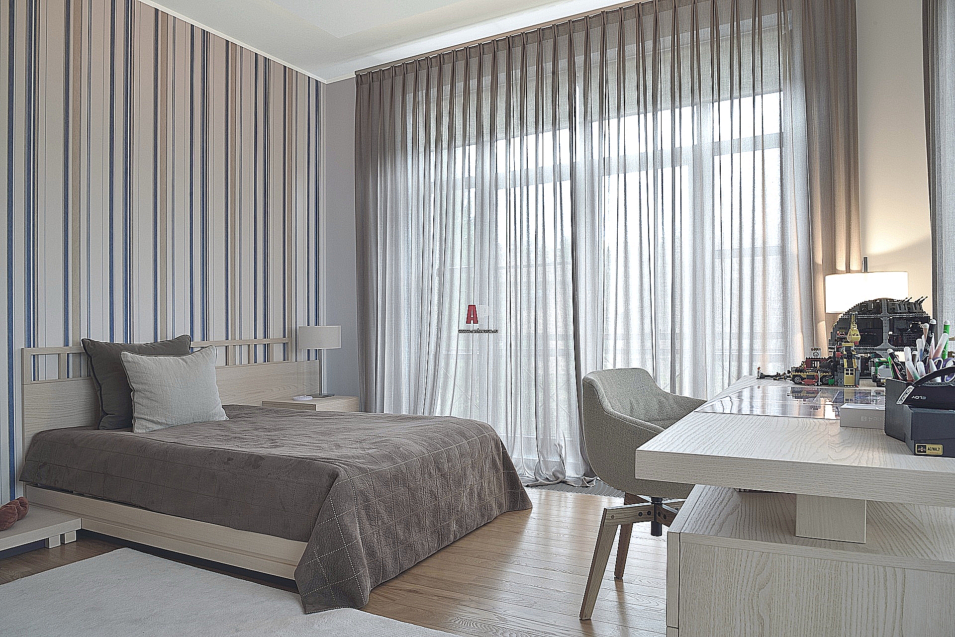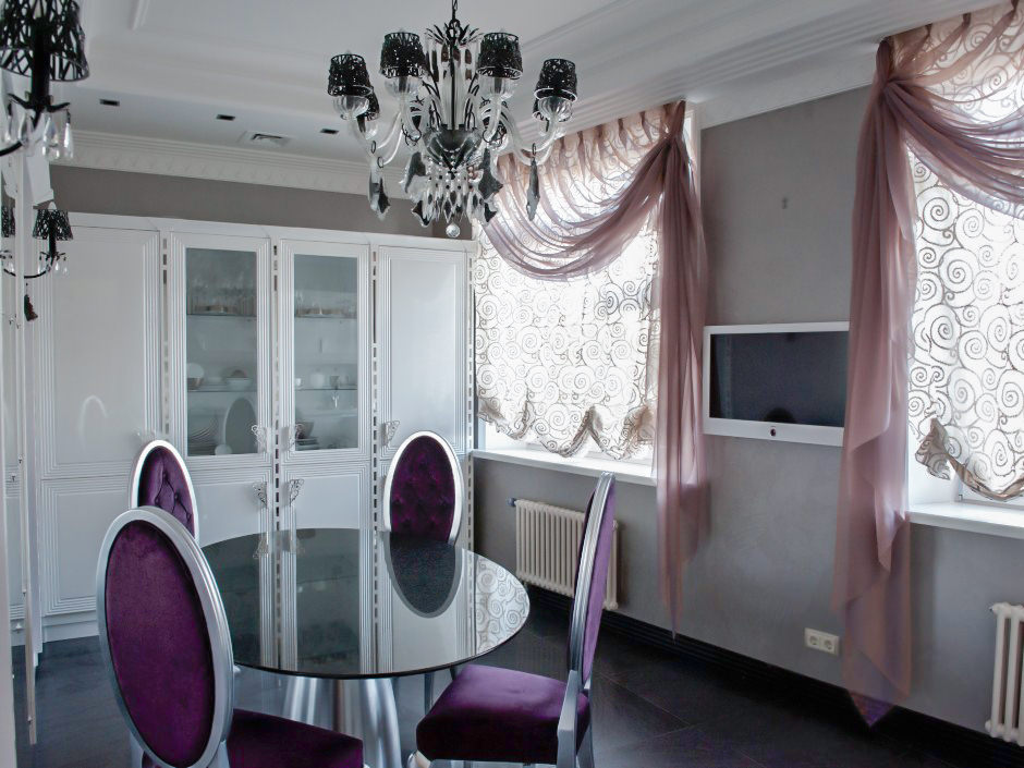 يخلق الشعور بالخفة والأناقة نسخًا احتفالية من الأقمشة للستائر ، والتي يتم نسجها بخيوط فضية لامعة. إنها تبرز من بين خيارات أخرى ذات تأثير لامع ورائع. يتم الجمع بين الستائر بنمط متماثل مطلي بالذهب تمامًا مع غطاء أحادي اللون وأغطية كلاسيكية للأرضيات.