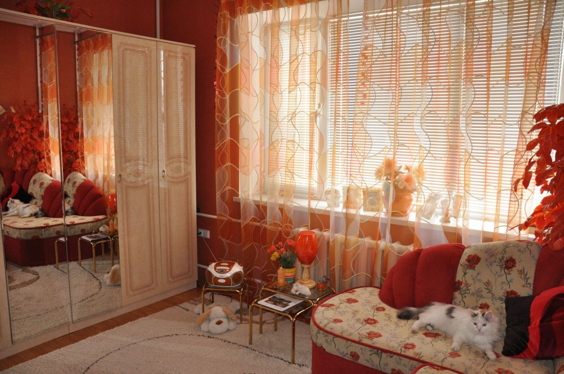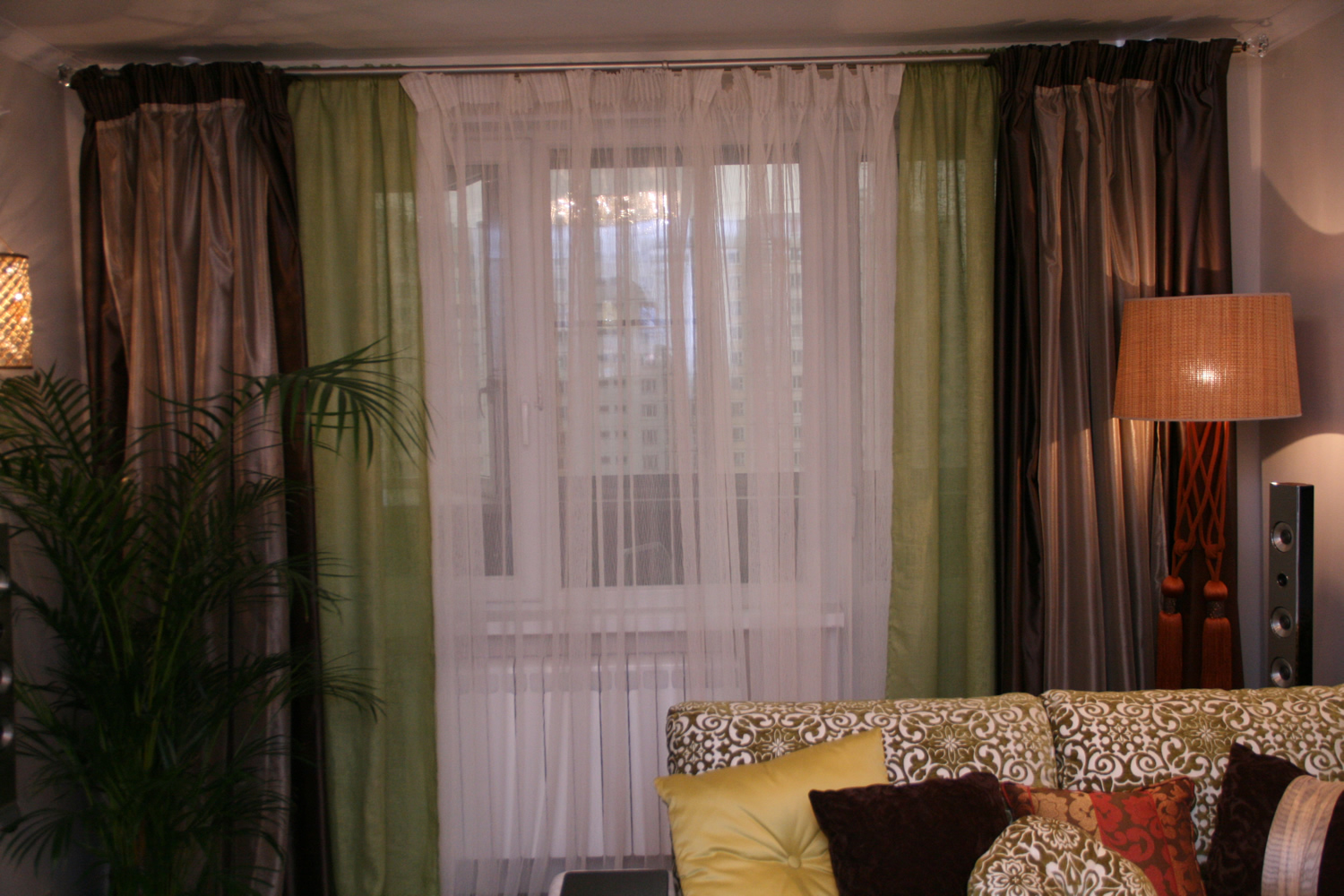 في غرفة المعيشة ، الغرفة المركزية ، الستائر - هذا ما يلفت النظر باستمرار.