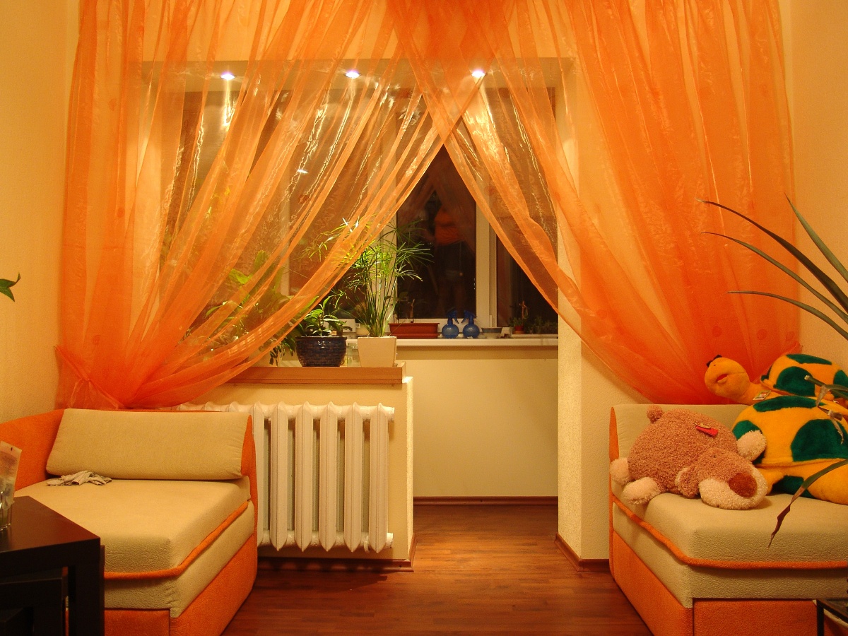 تزين الستائر ذات الألوان الدافئة (الصفراء والبرتقالية) النوافذ على الجانب الشمالي من المنزل بدرجة إضاءة منخفضة. تول اللون يحول بشكل ملحوظ الداخلية. يرسم أشعة الشمس بألوان دافئة لملء الغرفة بالضوء الساطع.