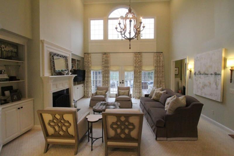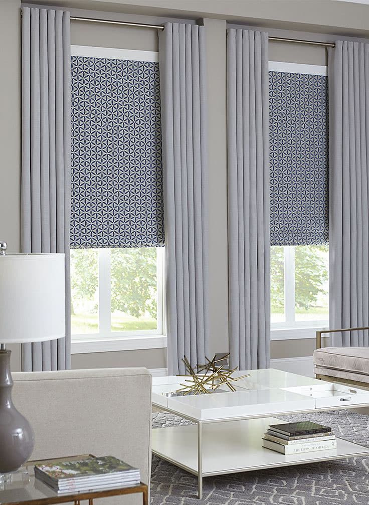 الستائر الرومانية الصلبة المصنوعة من القماش السميك تبدو رائعة في مجموعة مع الكلاسيكية في غرفة معيشة مشرقة ومريحة.