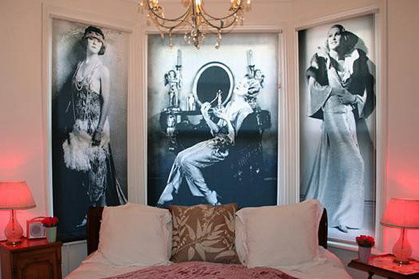 في غرفة النوم غالباً ما تستخدم الستائر مع صور فوتوغرافية بالأبيض والأسود.